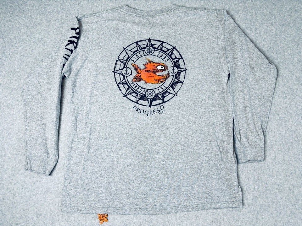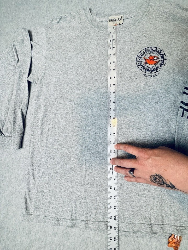 Pirana Joe Long Sleeve T Shirt Gray - Fish Tag - Progreso Mexico - 100% Cotton L