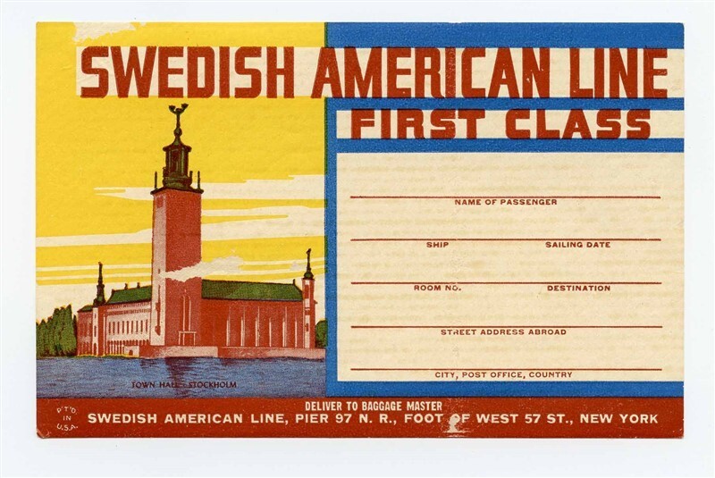 A Swedish American Line First Class Unused Luggage Label. Measures about 5 1/2" x 3 1/2" and has full glue on the back.