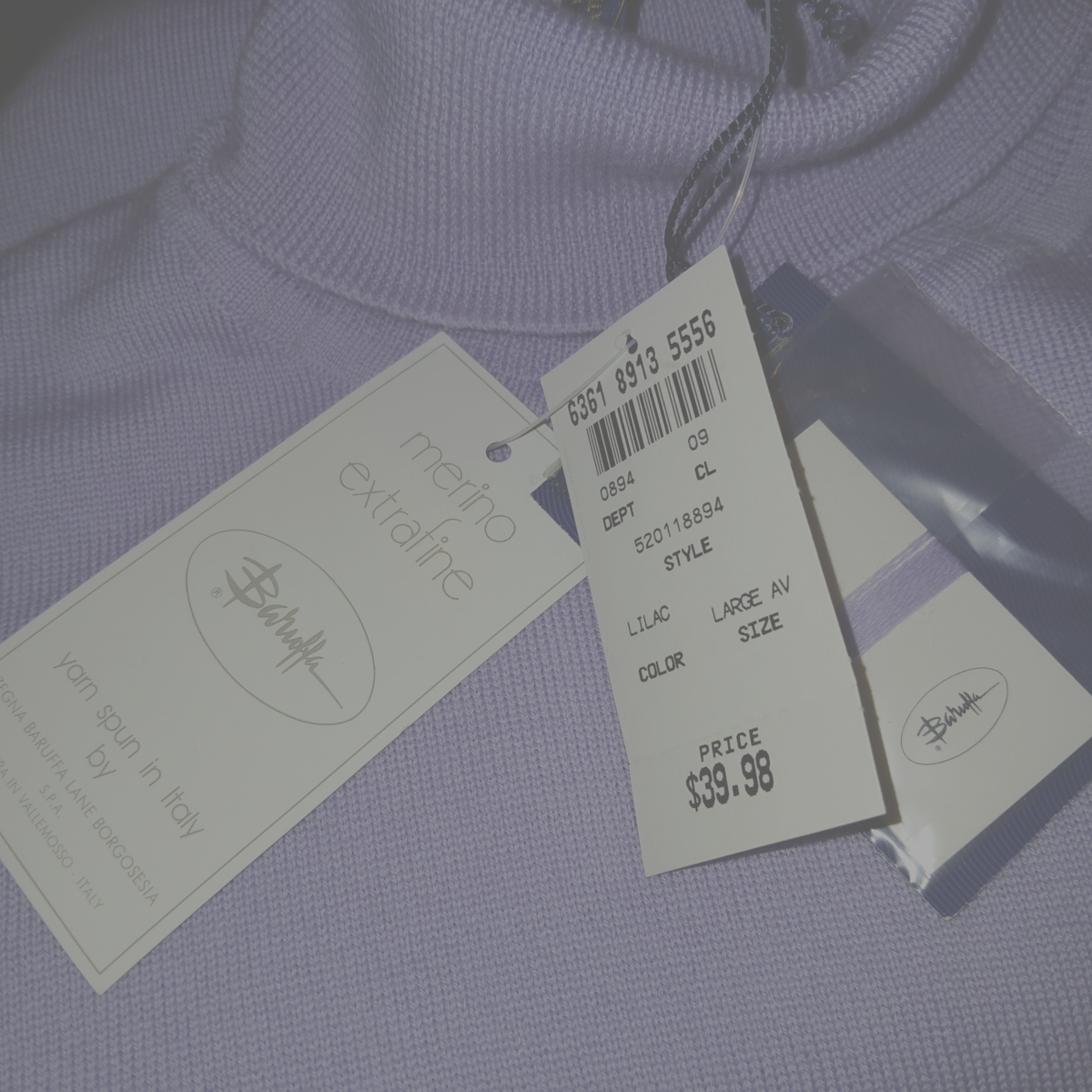 THIS IS A LOVELY LADIES CHARTER CLUB COLLECTION LILAC 100% EXTRA FINE ITALIAN MERINO WOOL LONG-SLEEVED TURTLENECK. IT IS NEW, WITH TAGS ATTACHED AND PRICE TAG OF $39.98..