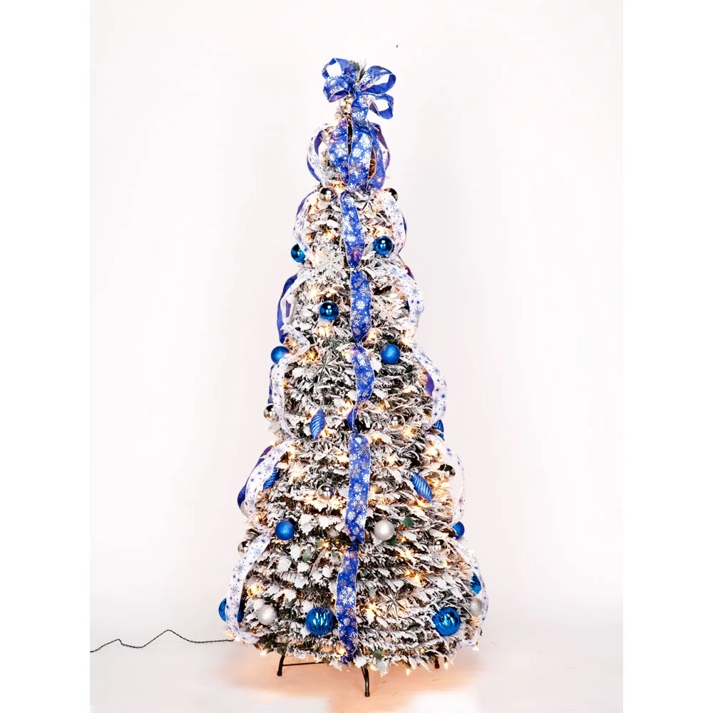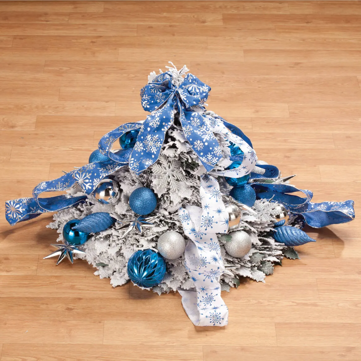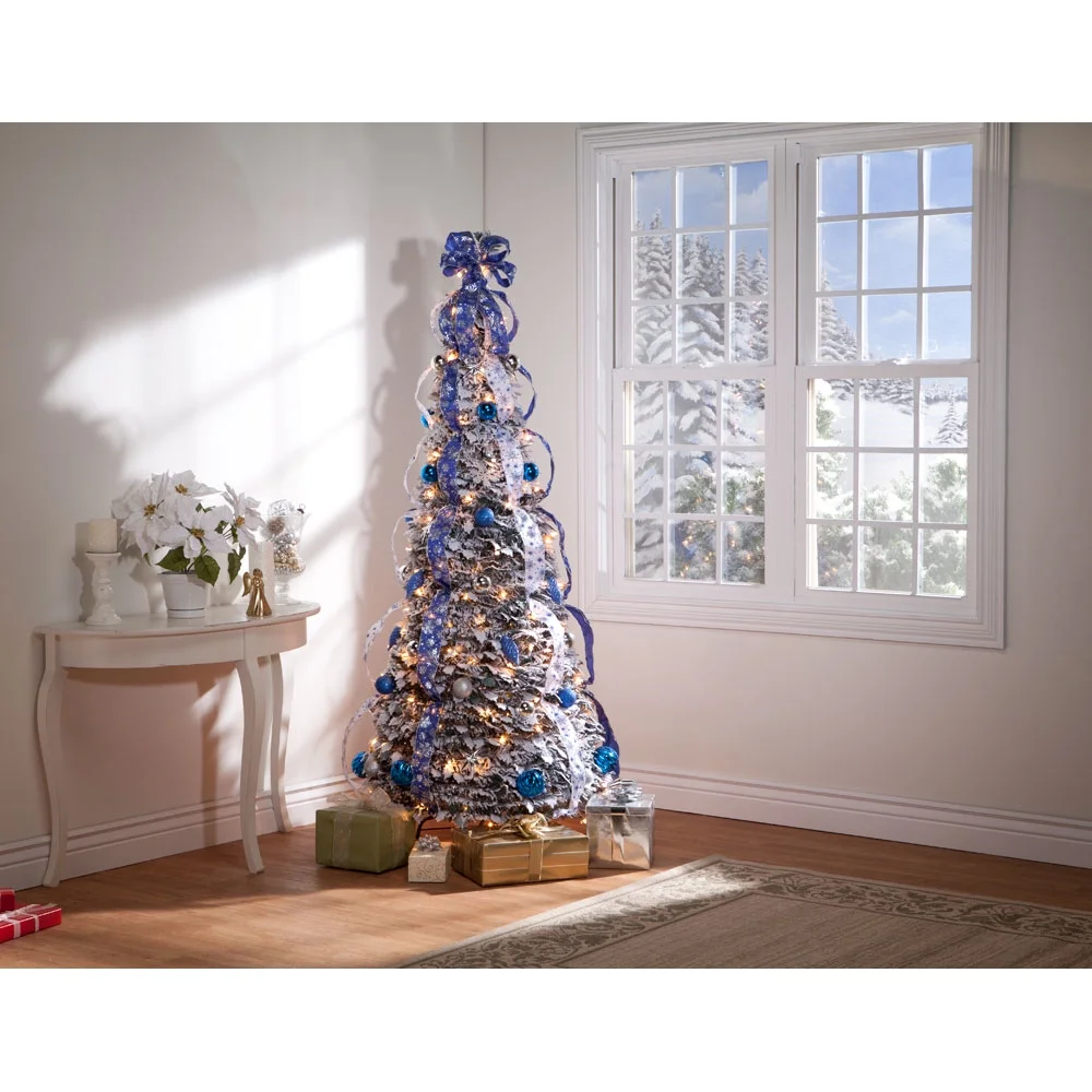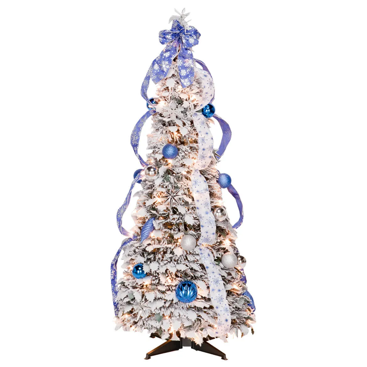 Decorating for the holidays is a breeze when you choose this fully decorated Christmas tree. The beautiful flocked branches give the impression of fresh snow and match perfectly with the blue and white decorations. This realistic artificial tree stands at 4 feet tall and features effortless pull-up assembly. All you need to do to assemble it is pull it up, put it in the included plastic stand and plug it into a wall socket. It comes pre-lit with 100 incandescent lights in addition to the dozens of blue and silver ornaments, decorative ribbon and bow topper. After Christmas, collapse the tree the same way you put it up and store it until next December. Indoor use only.