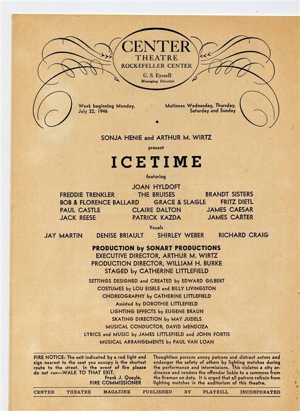 From the Center Theatre at Rockefeller Center in New York City during July 1946 . A Playbill from Icetime by Sonja Henie and Arthur M Wirtz. In very good condition.