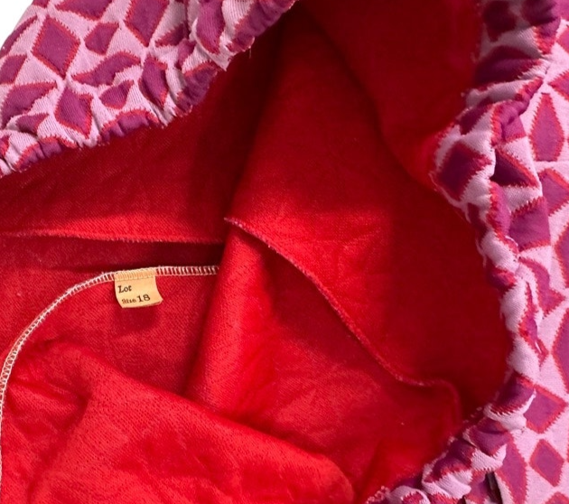 Vintage 1970s polyester bell bottom flare pants in a super mod purple diamond print outlined in red on a lavender ground. Women?s size 14. Pull-on style with elastic waist and light stretch in the fabric. Deadstock ? never worn, still with original tagger attached.