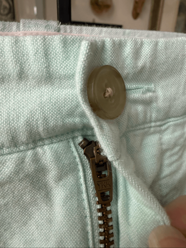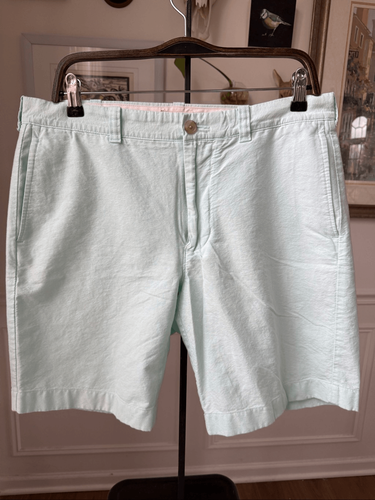 J CREW gramercy Mens sun washed Oxford Gramercy, sea glass, aqua green, 100% cotton flat front shorts with 9? inseam. Hip pockets and two back welt pockets. Hook and zip closure. 37201 Sz 34