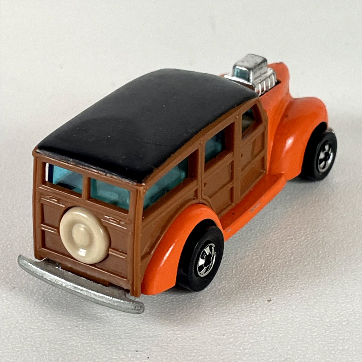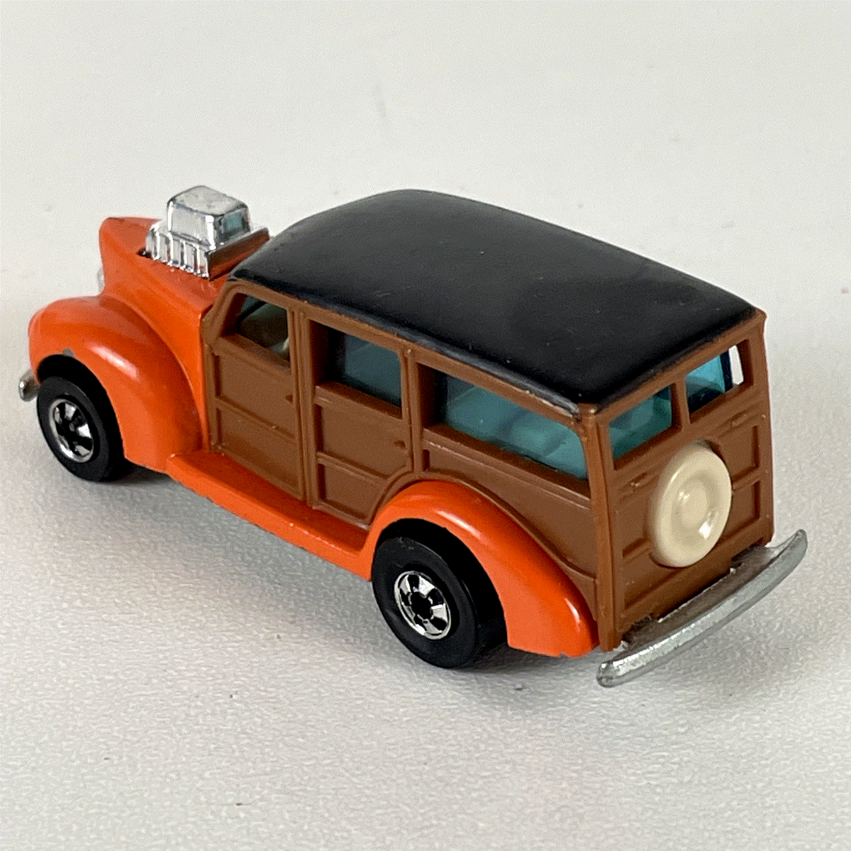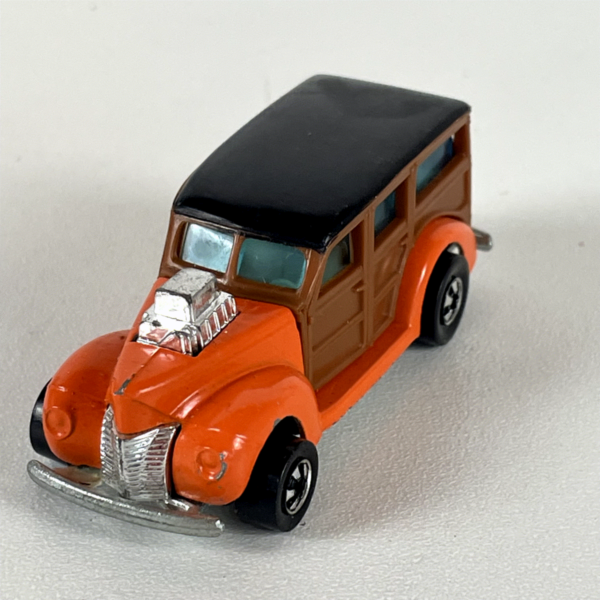 Discover this vintage Hot Wheels diecast model, a standout 1977 release featuring a custom 1940 Ford Woody Wagon. This unique piece captures the essence of classic hot rod culture with its vibrant orange front fenders and a simulated brown wood paneling on the wagon body, topped with a sleek black roof. The detailed design includes a prominent chrome supercharger (blower) engine protruding from the hood, chrome front and rear bumpers, and a classic spare tire mounted on the rear.