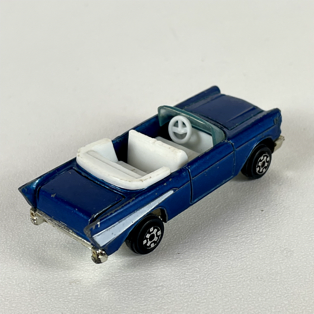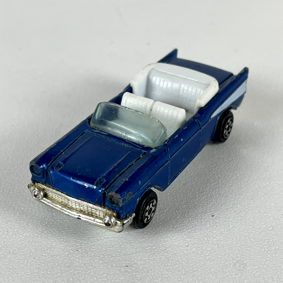 Discover this classic KIDCO diecast model, a meticulously crafted miniature of the iconic 1957 Chevrolet Bel Air Convertible. Produced in 1979, this vintage piece showcases the distinctive styling of the era, featuring a striking dark blue exterior complemented by a crisp white interior and a detailed white side stripe. The chrome-look bumpers and grille add to its authentic vintage appeal, making it a standout addition for any collector of classic American automotive memorabilia.