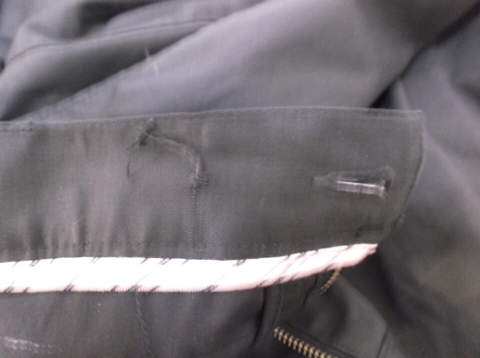 Defects: Fabric on pant leg cuffs are worn and lightly discolored, Missing button for inside waist, refer to pictures