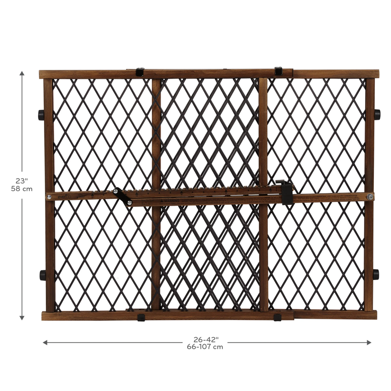 ? BLOCK DOORWAYS WITH A BASIC GATE: With a gate height of 23 in. (58 cm), fits standard width openings measuring 26 in. to 42 in. (66 cm to 107 cm) ? INSTALL EASILY: Simple lift and lock method installs and un-installs with ease ? KNOW FOR SURE IT?S SECURE: Latch easily slides onto the locking bar for peace of mind that your gate is securely installed ? KEEP IT LOOKING FRESH: Features a wood frame with lightweight plastic mesh which is easy to clean ? KEEP THEM SAFE: Helps to maintain a safer home environment for children ? and pets, too!