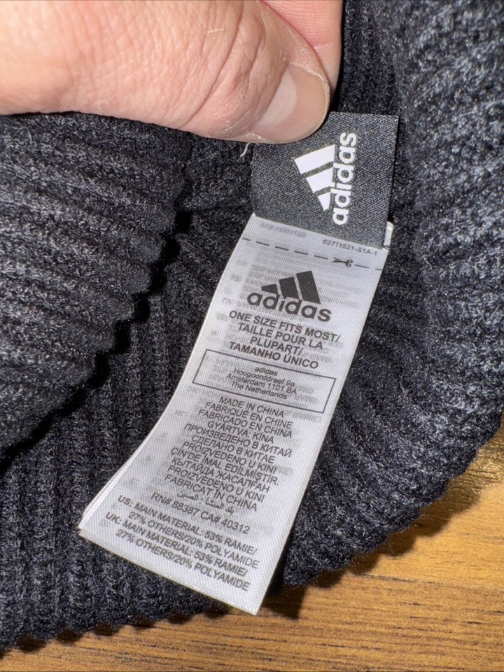 The product is a black cuffed beanie featuring a camo logo by Adidas, suitable for unisex adults. The hat is made of knit fabric and is designed for winter wear, making it ideal for travel, casual outings, or workwear. The one-size design and solid black/camo color pattern add both style and comfort to this accessory.