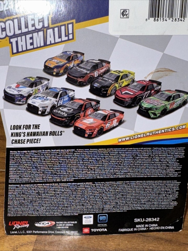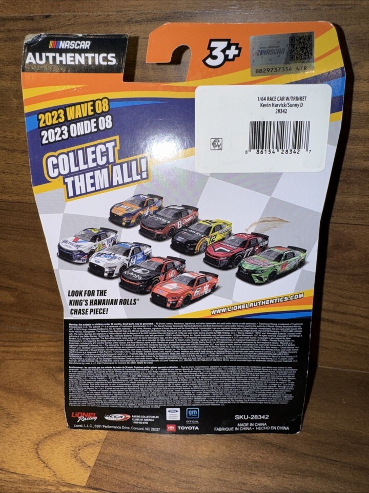 The 2023 NASCAR Authentics Wave 8 Kevin Harvick SunnyD 1:64 Diecast is a collectible toy vehicle featuring a Ford NASCAR racecar driven by Kevin Harvick. Made of diecast material, this multi-color model comes in a 1:64 scale and is part of the Authentics series by Lionel. It is a replica of a car from the Daytona race series and is suitable for children aged 3 and up. This unopened box toy is a must-have for fans of NASCAR and diecast vehicles.