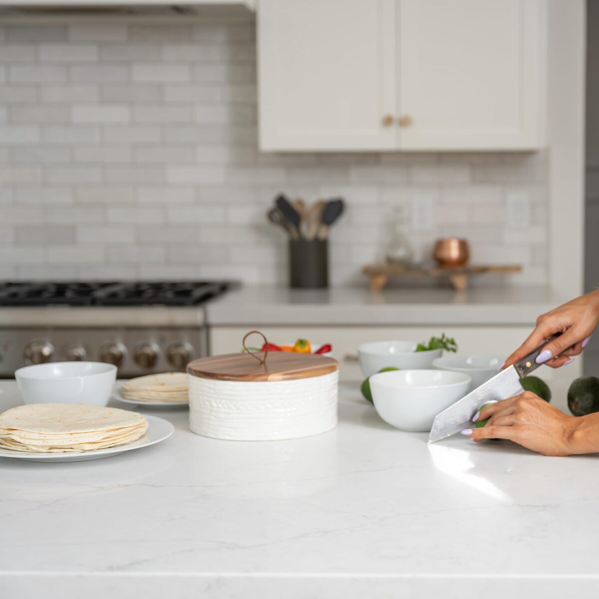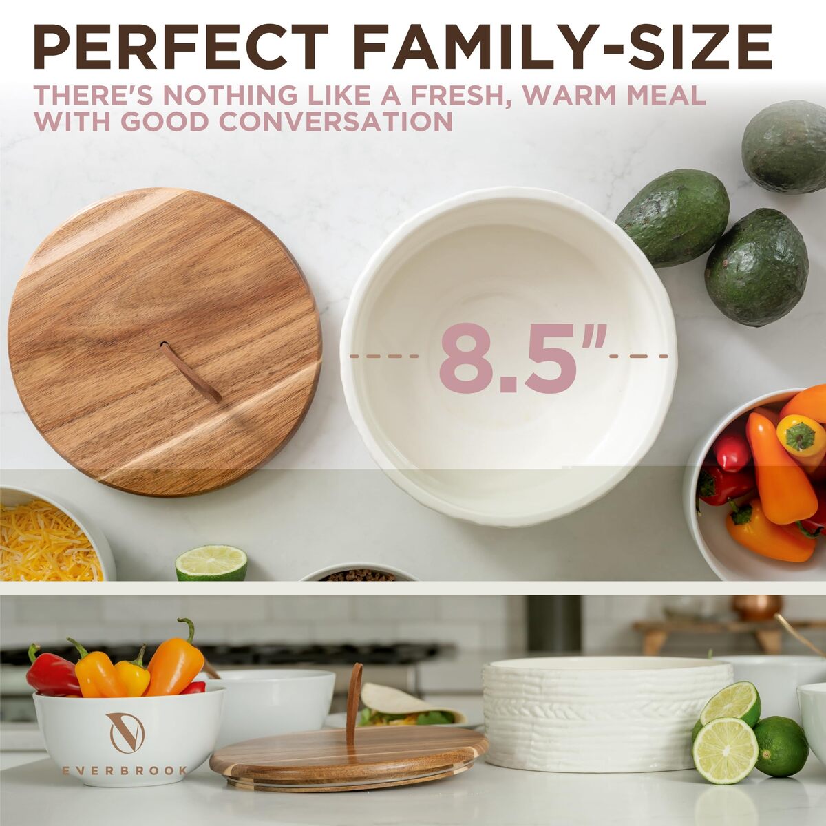 Everbrook Ceramic & Wood Tortilla Warmer with Lid - 8.5" - Holds 24 Tortillas