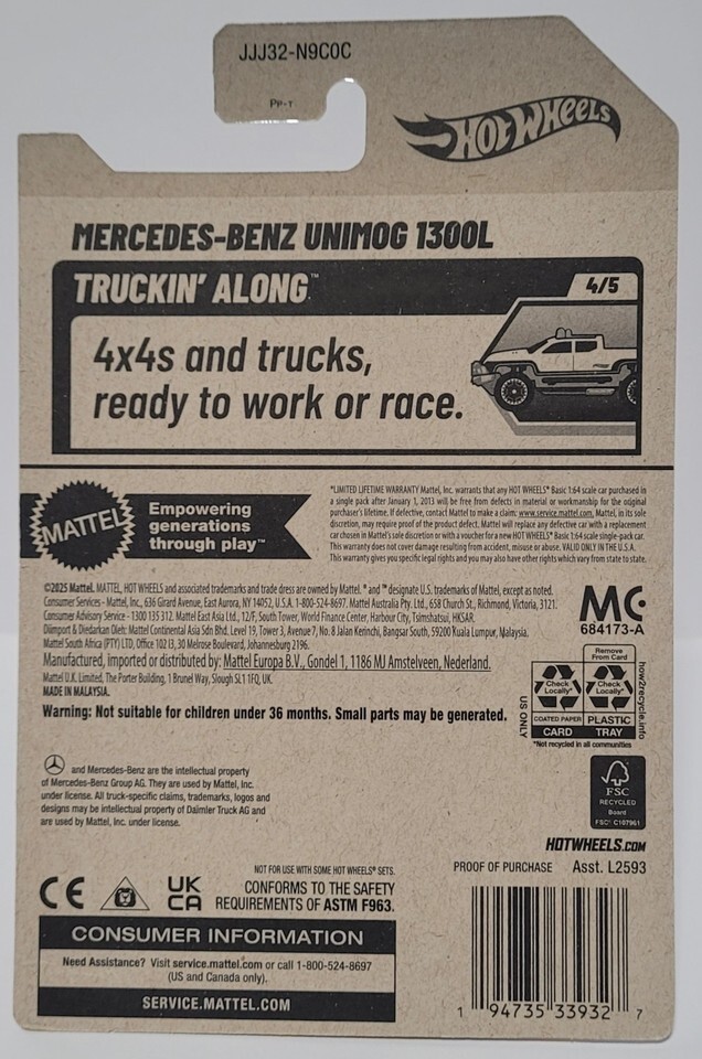 The 2026 Hot Wheels Mercedes-Benz Unimog 1300L 64/250 Purple Truckin' Along 4/5 is a diecast toy vehicle in 1:64 scale. This officially licensed Mercedes-Benz truck is part of the Truckin' Along series by Hot Wheels. Featuring a purple color, this collectible toy is recommended for children aged 3 and up, and is a great addition to any diecast vehicle collection. Made in Malaysia, this unopened box toy is perfect for both boys and girls who enjoy playing with cars and trucks.