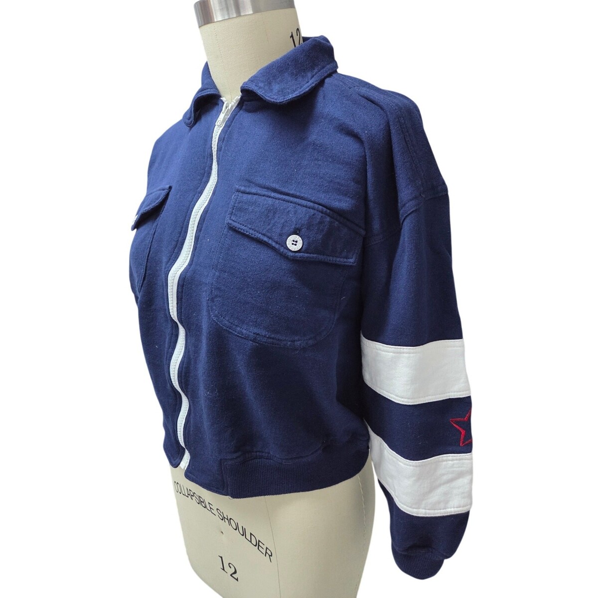 What you?ll love about this Boston Traders zip-front jacket is the sporty, graphic contrast ? deep navy cotton body paired with bold white striped sleeves and a crisp plastic zipper. It?s classic late-1970s athletic-casual with a cropped, cinched silhouette that feels effortlessly cool and gender-neutral.