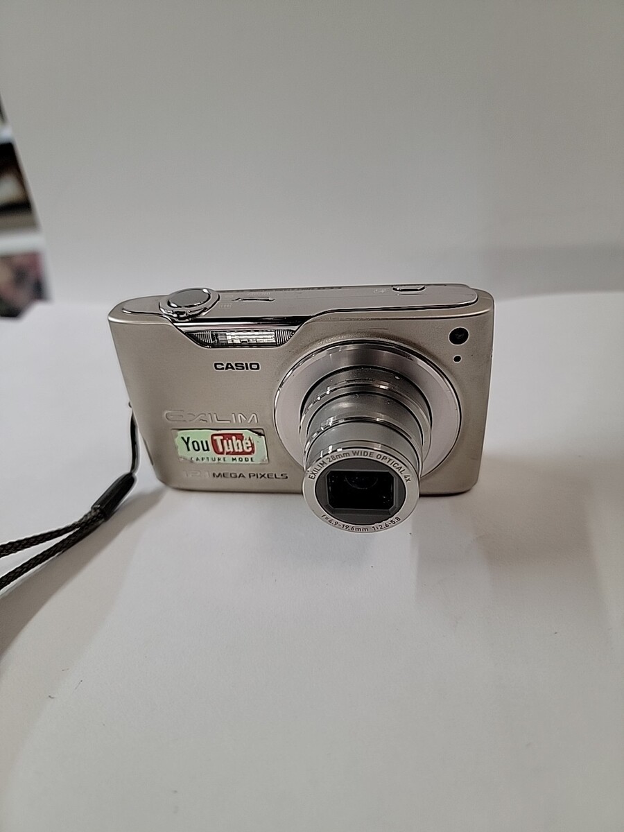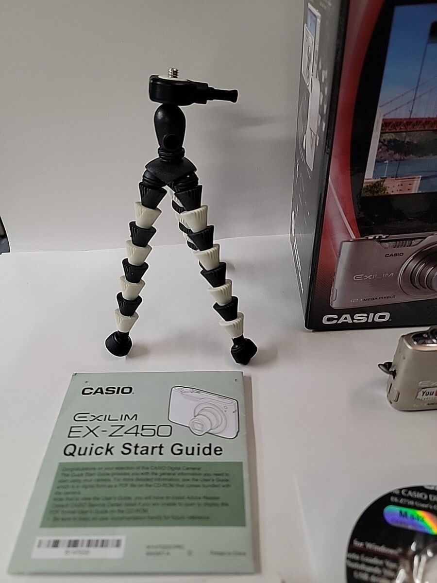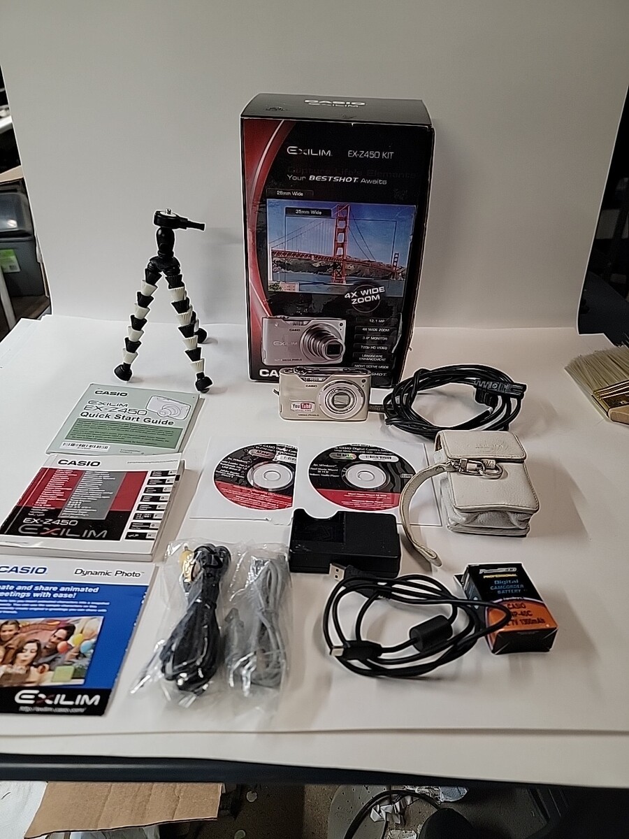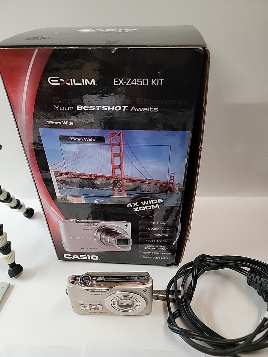 The Casio EXILIM EX-Z450 Kit Digital Camera is a compact camera with a sleek silver design. It features a 3-inch screen, 12.1 MP maximum resolution, and 3x optical zoom. The camera also includes a 4x digital zoom, lithium-ion battery, and night scene mode for capturing low-light shots. The kit includes a charger for convenience. With a lightweight design of 3.6 oz., this Casio EXILIM camera is a reliable choice for capturing high-quality photos on the go. This kit includes camera, camera case ,battery charger , battery, tripod ,CD-ROM ,wrist strap, power cord, and AV cable