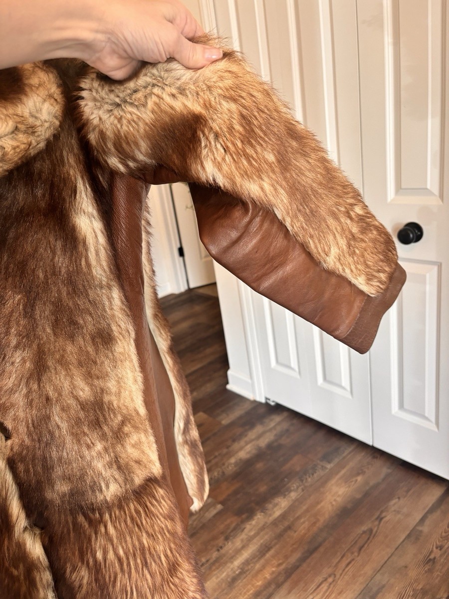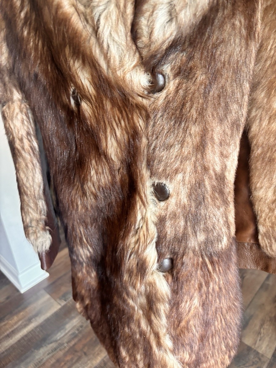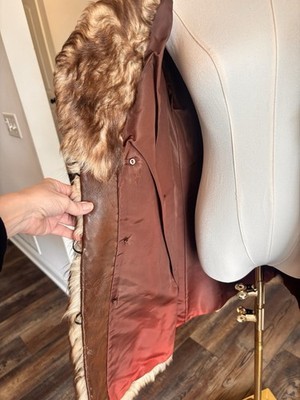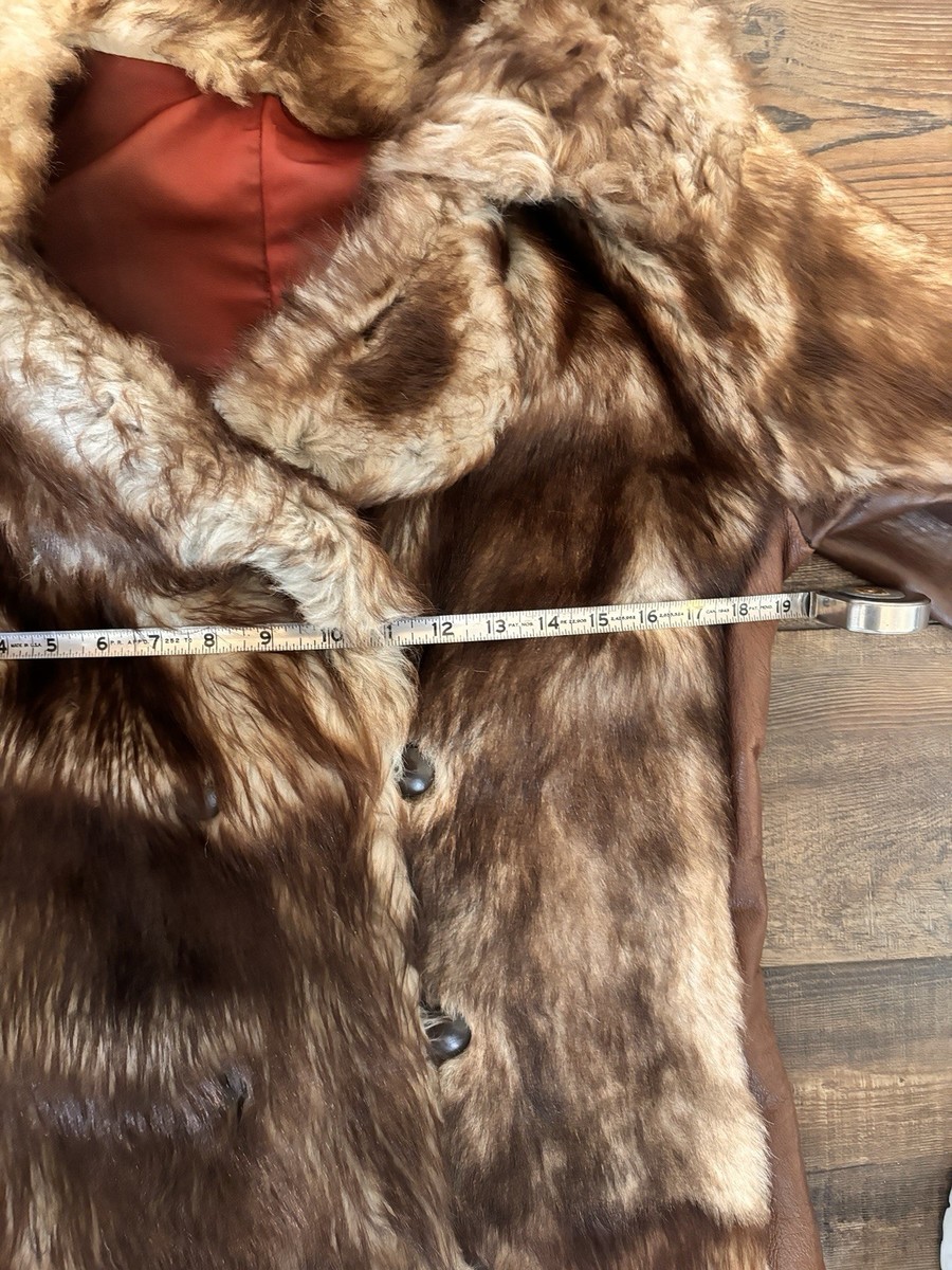 Vintage 70s Genuine Raccoon Fur & Leather Long Coat Brown Glam Shawl Collar Med