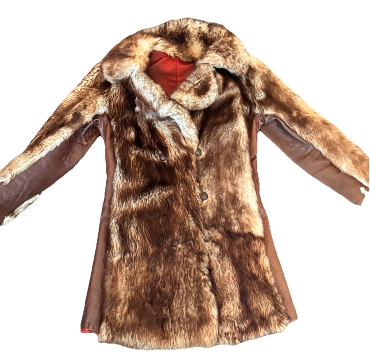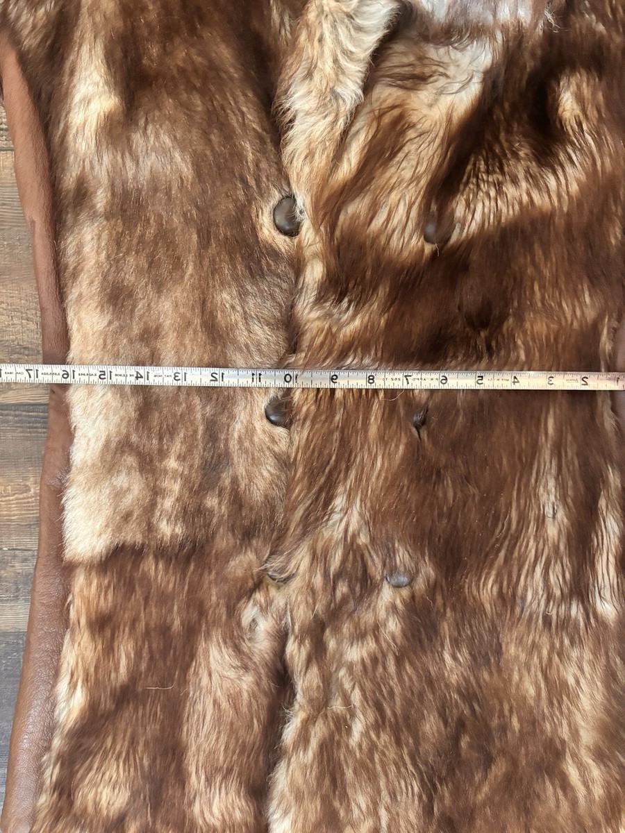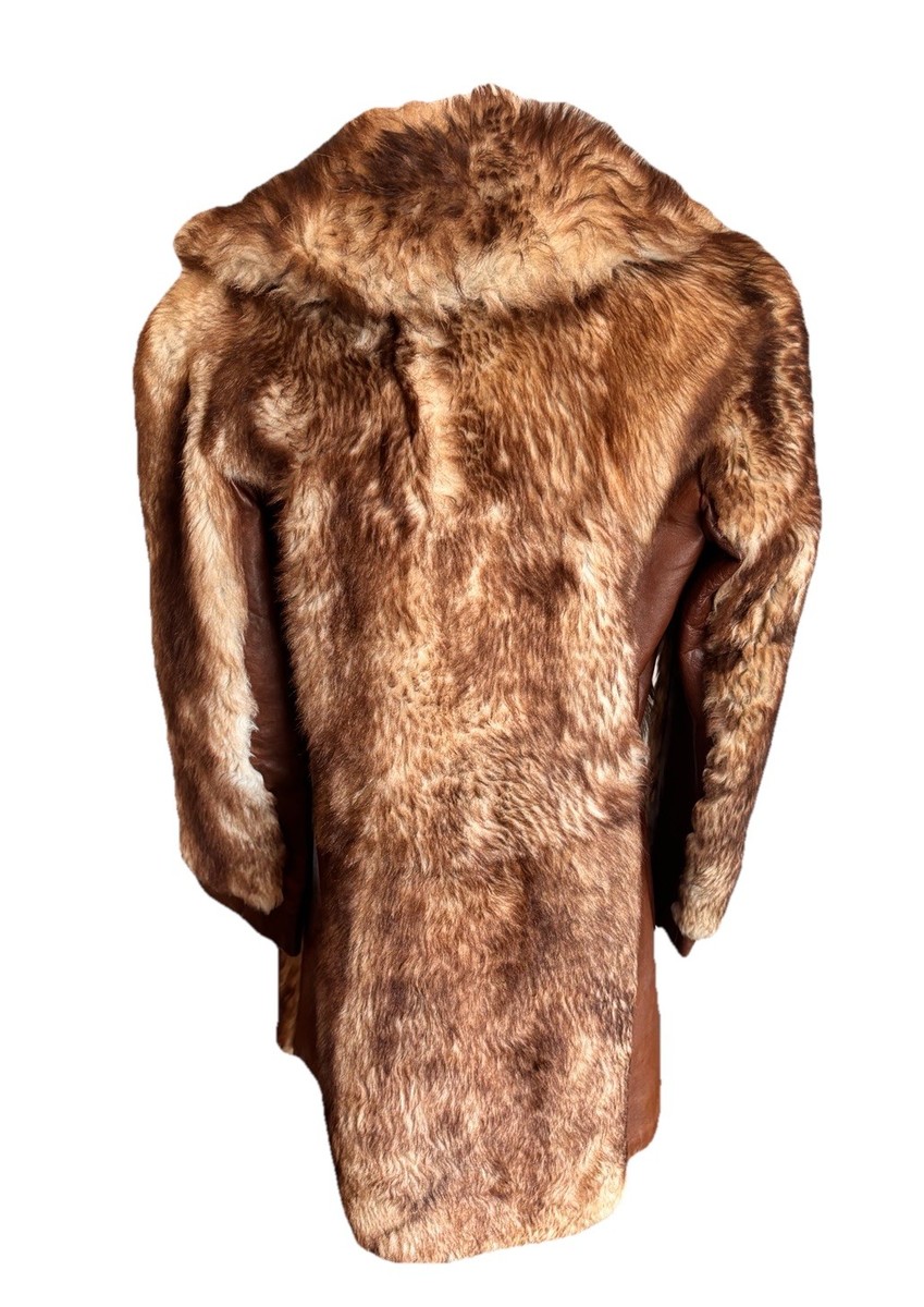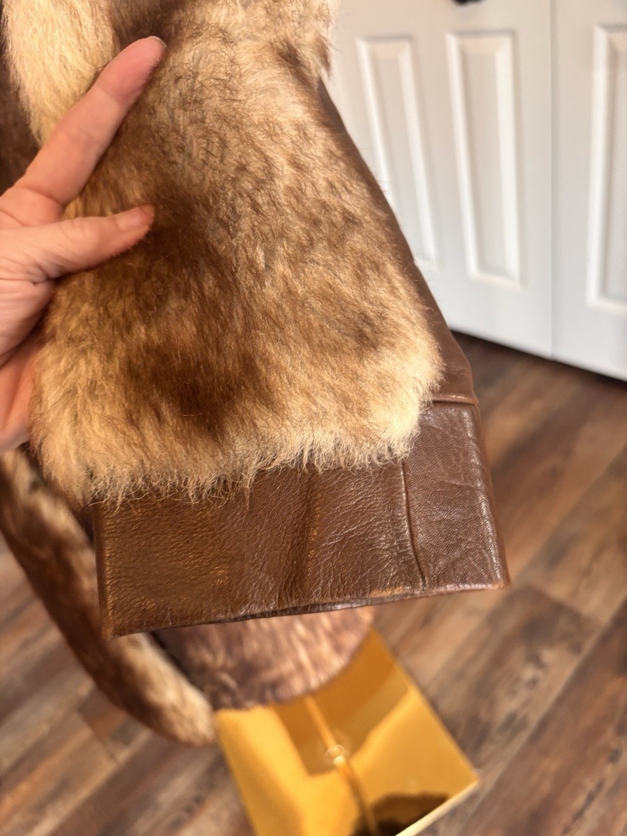 Vintage 70s Genuine Raccoon Fur & Leather Long Coat Brown Glam Shawl Collar Med