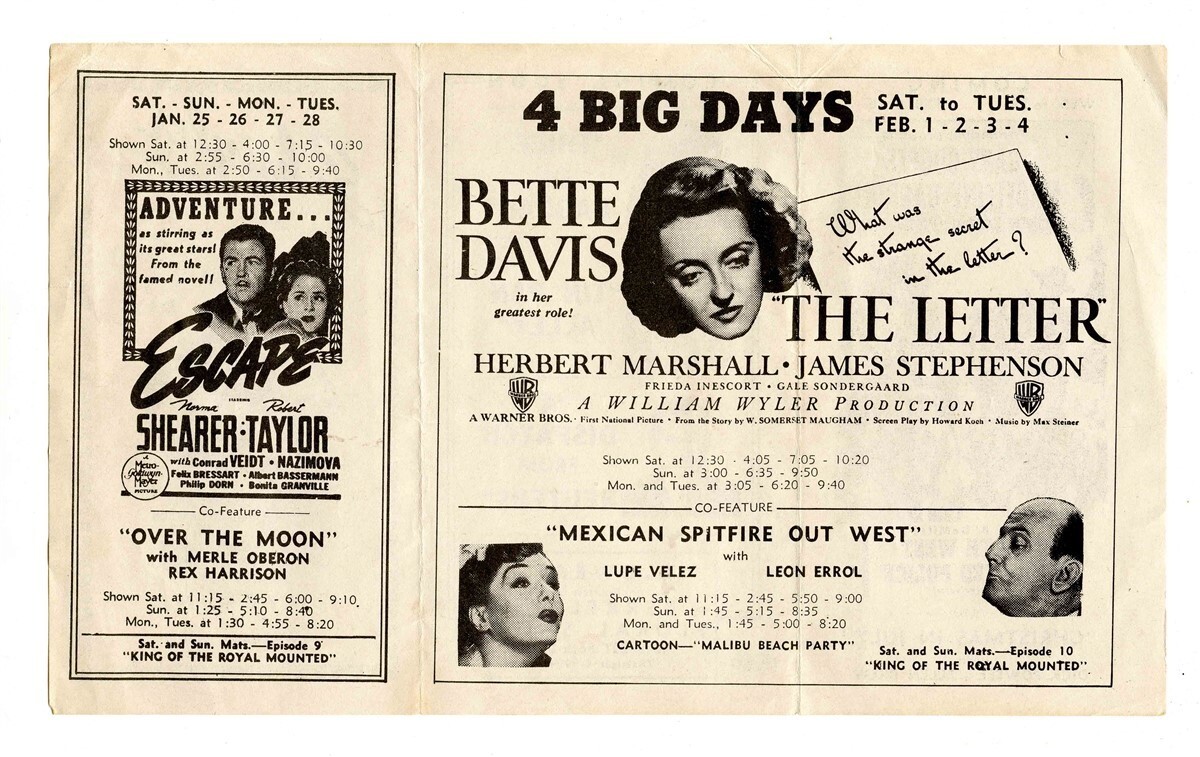 A 6 panel fol dout Schuyler Theatre 1940 Flyer . Located on Columbus Ave in New York City . Includes Too Many Girls with Lucille Ball , Northwest Mounted Police with Gary Cooper and The Letter with Bette Davis and more