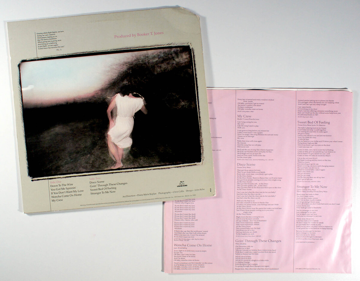 Flying, by Priscilla Coolidge Jones, is a 1979 rock album blending southern rock and pop rock elements, produced by her then-husband Booker T. Jones. It features a mix of original tracks and covers, including a rendition of John Prine and Phil Spector's If You Don't Want My Love, which stands out as a notable highlight often referenced from the record. Other tracks like Down To The Wire, You Got Me Spinnin', and Woncha Come On Home (a Joan Armatrading cover) showcase her versatile vocal style and the album's eclectic songwriting contributions from various writers. Priscilla, sister of Rita Coolidge and a respected session vocalist who collaborated with artists like Bob Dylan and Emmylou Harris, brought her singer-songwriter background to the project, though it remains a relatively obscure entry in her discography.