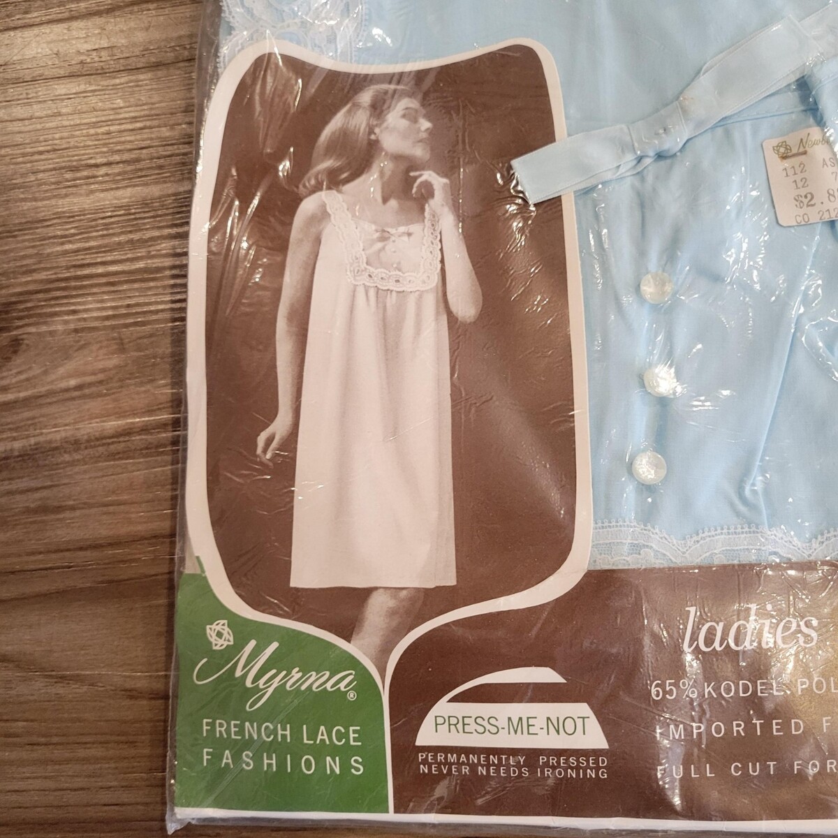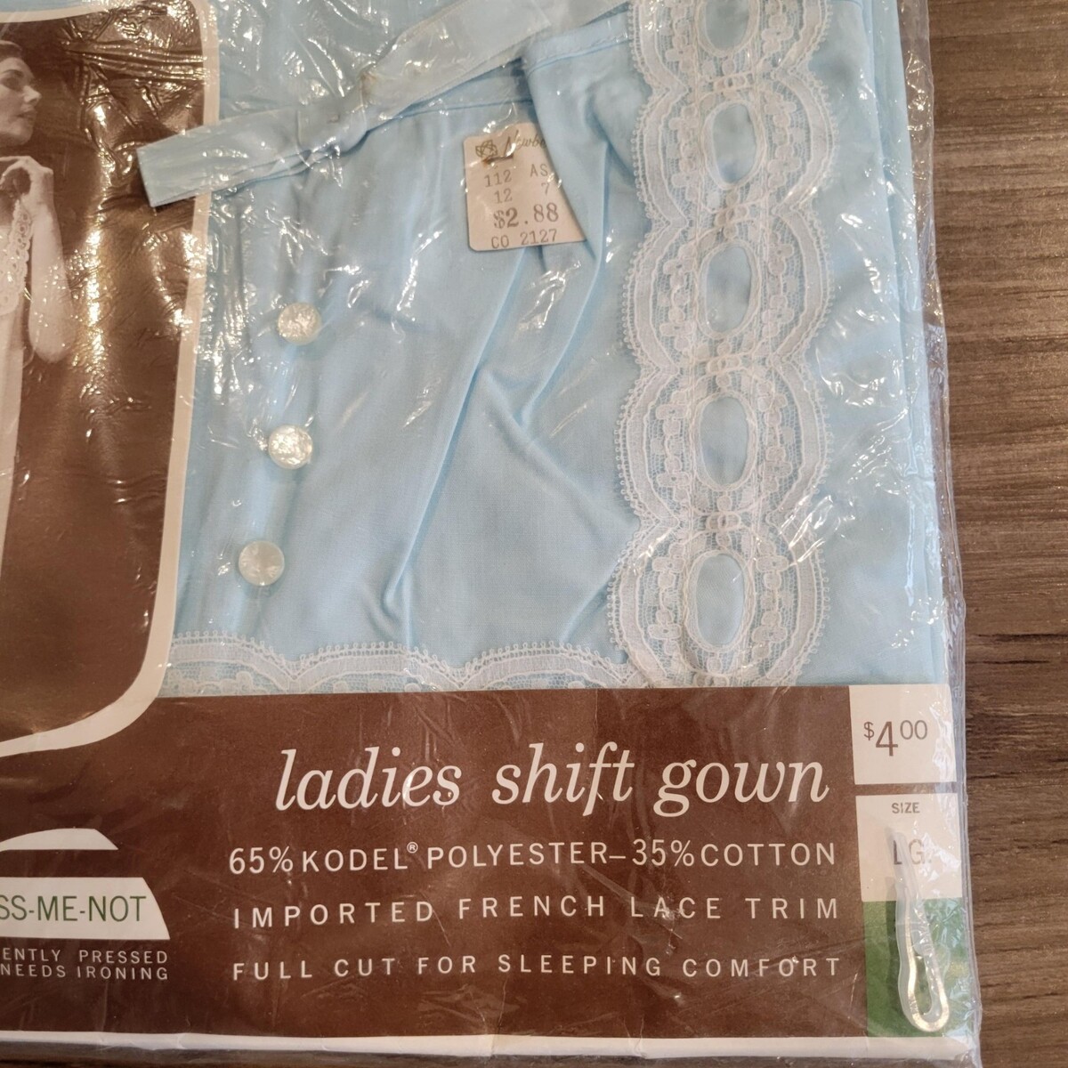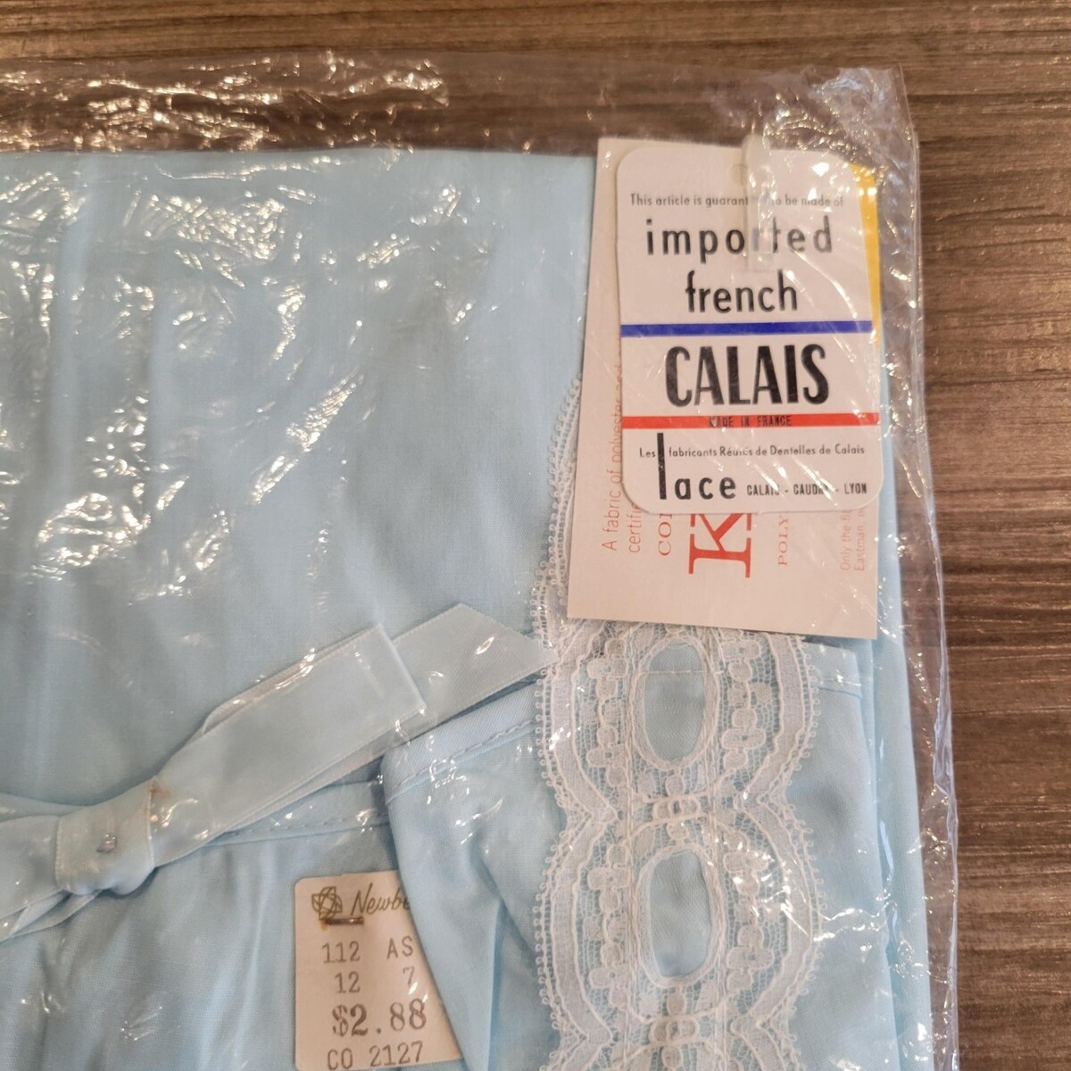 Vintage 1960s Myrna French Lace Trim Shift Nightgown Blue Size L NEW Old Stock