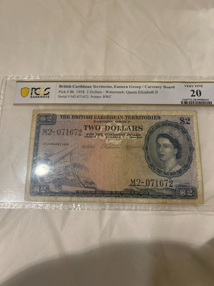 Up for sale is a scarce 1961 British Caribbean Territories $2 note (Pick #8c) featuring the portrait of Queen Elizabeth II. This note has been professionally graded and authenticated by PCGS Banknote as 20 Very Fine.