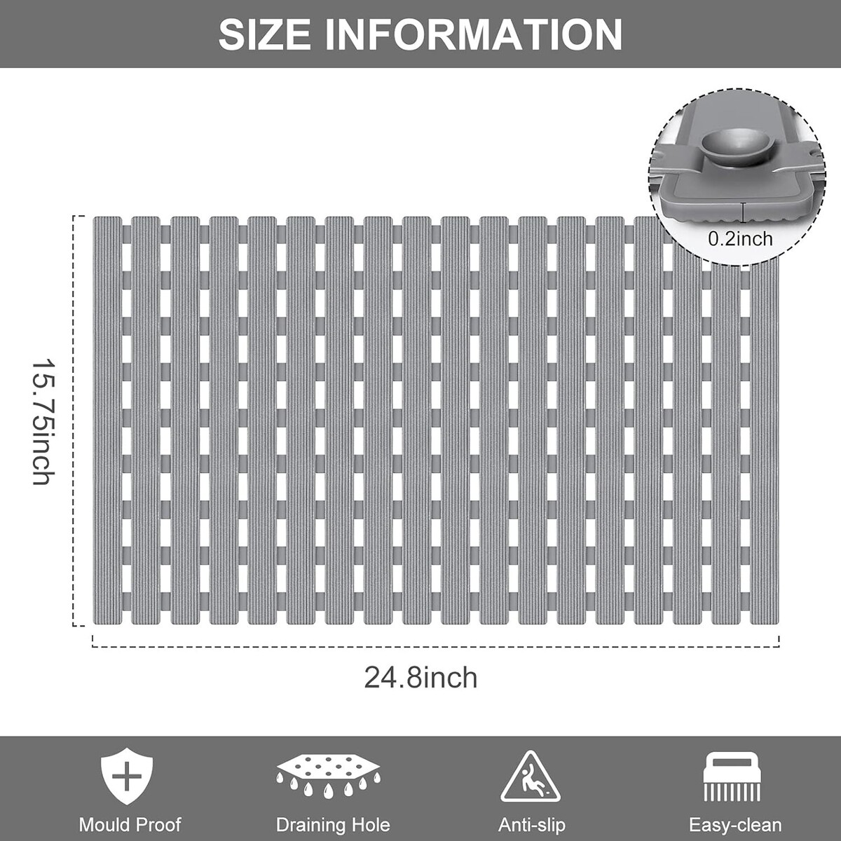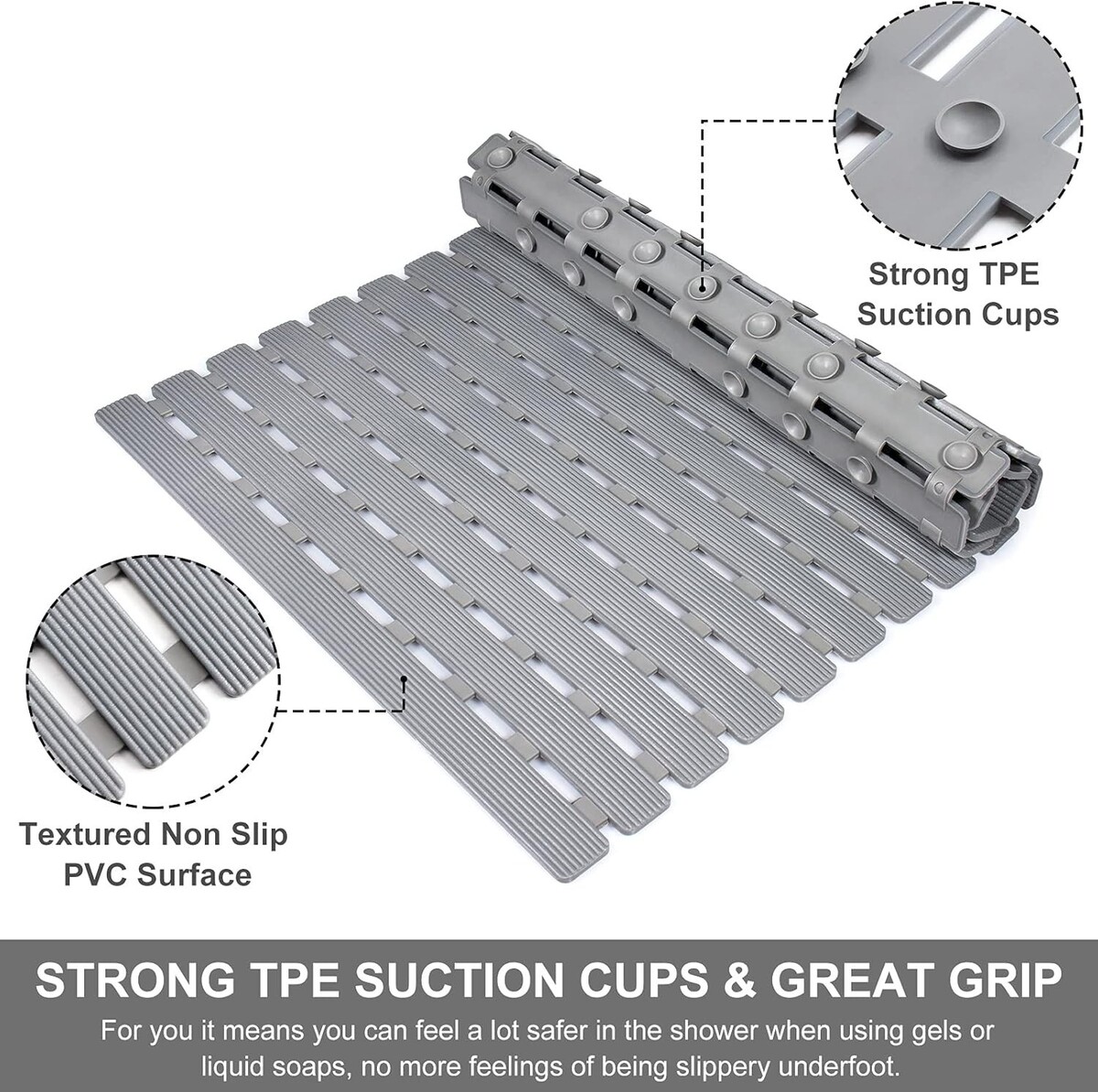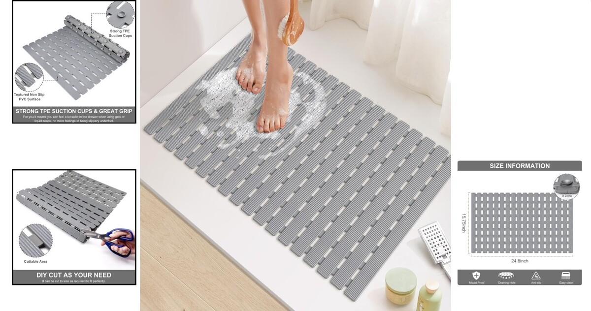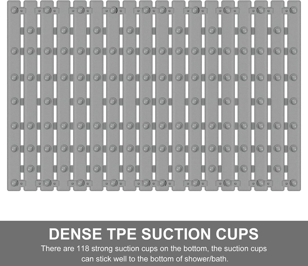 Versatile 24.8x15.8in Grey Non-Slip Shower Mat with Powerful Suction Cups