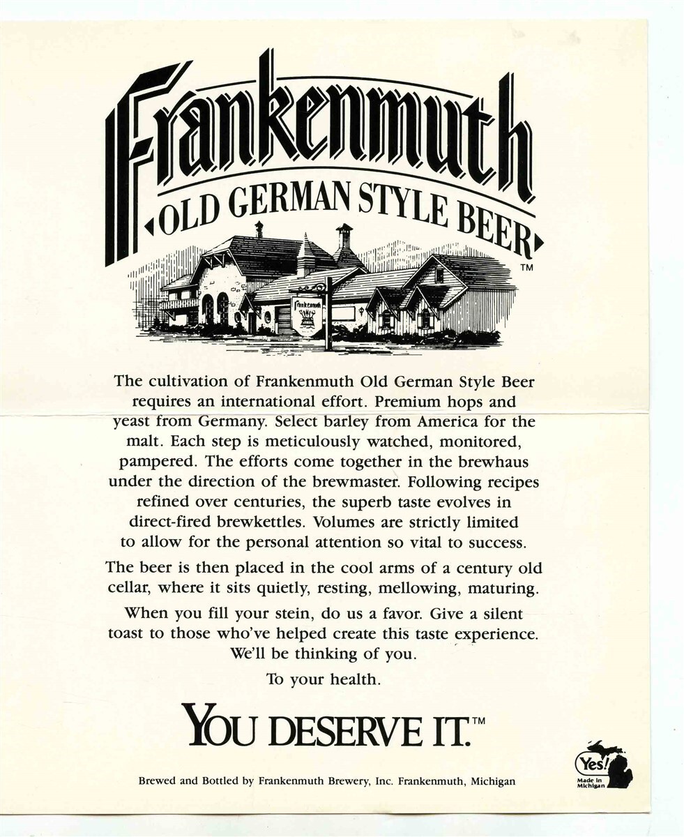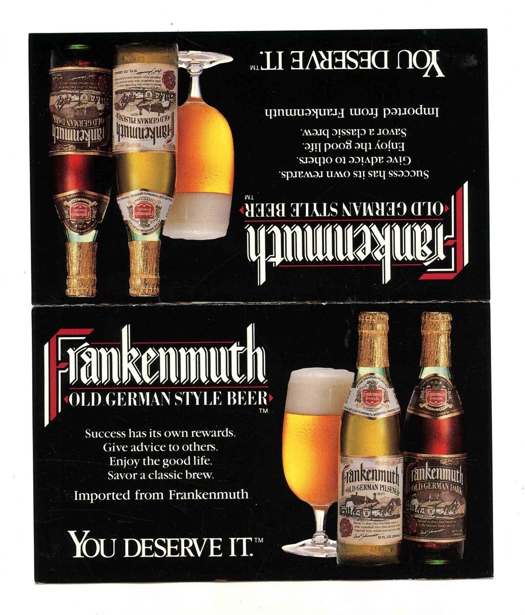 There are 8 different Frankenmuth Old German Style Beer Labels in this lot ( 4 bottle labels and 4 neck labels) And a Frankenmuth Table Top Sign . From Frankenmuth Michigan