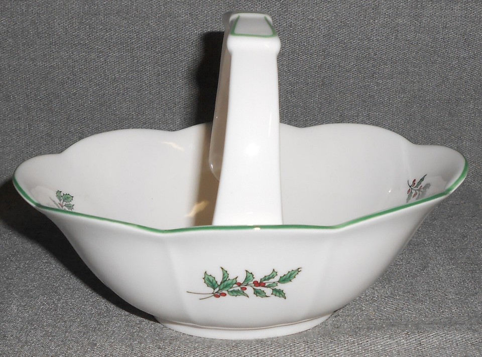 This is the Small Basket that measures approx. 6" long x approx. 4 1/2' wide x approx. 4" tall to top of handle that goes with both the Nikko Christmastime and Happy Holidays Patterns. It is clean and in good pre-owned condition with no chips or damage.