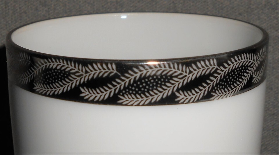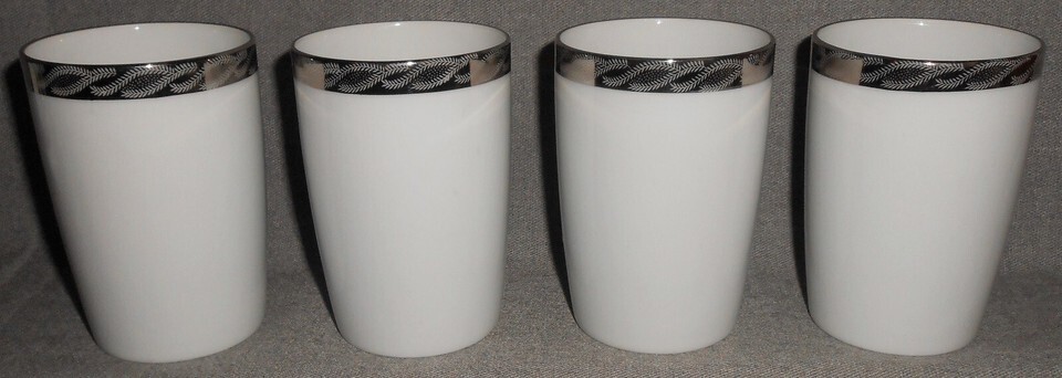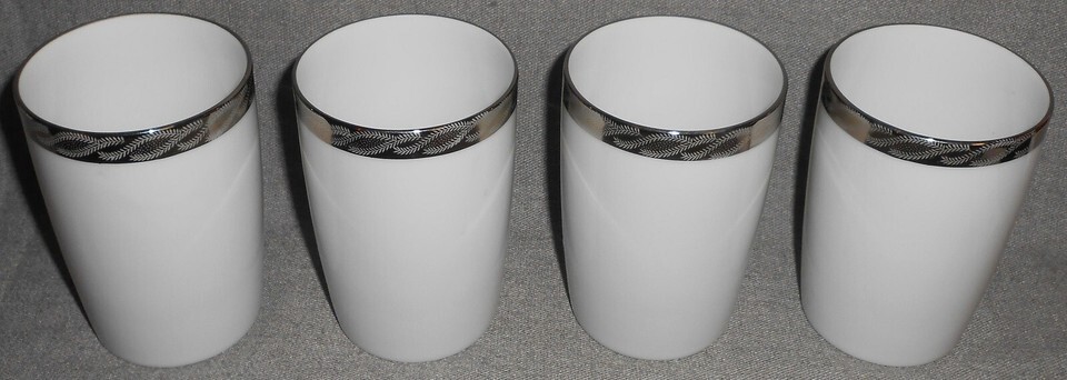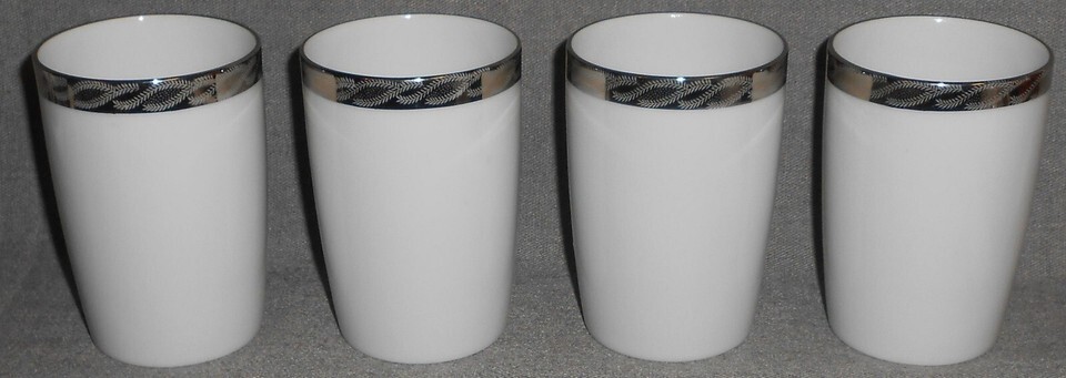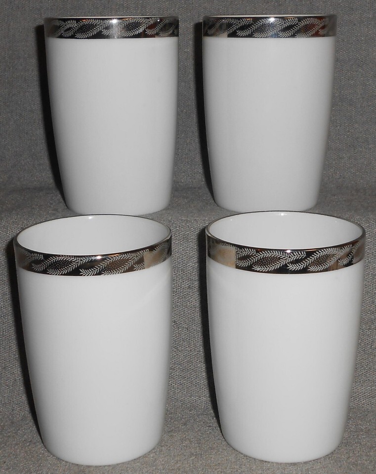 This is a Set of (4) 6 oz 4 1/8" tall Tumblers from Fukagawa Arita in the Mid Century 1950s-60s Silver Lichen #917 Pattern and Made in Japan. The platinum trim is vibrant with no wear and the tumblers are in good pre-owned condition with no chips or damage.***PLEASE NOTE: The discoloration and bright spots on the platinum trim or surfaces are from the camera/lighting. All of the color and platinum trim are in perfect condition with no discoloration or wear***