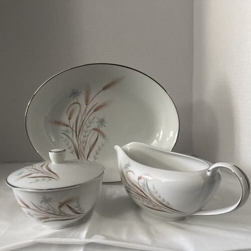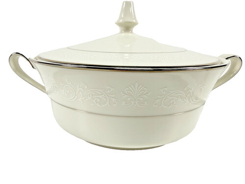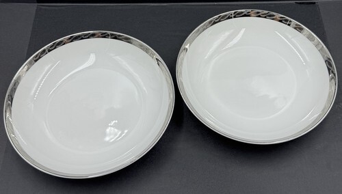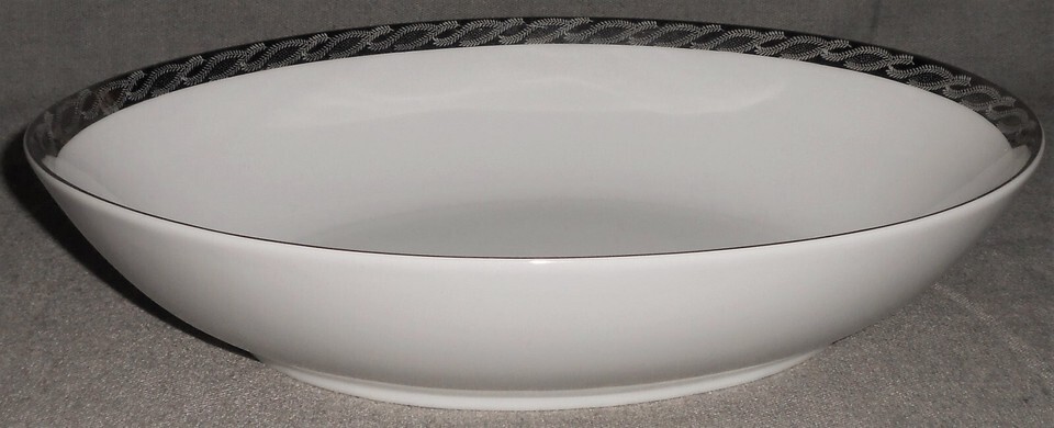This is the 10 1/4" x 7 1/2" Oval Vegetable or Serving Bowl from Fukagawa Arita in the Mid Century 1950s-60s Silver Lichen #917 Pattern and Made in Japan. The platinum trim is vibrant with no wear and the bowl is in good pre-owned condition with no chips or cracks.