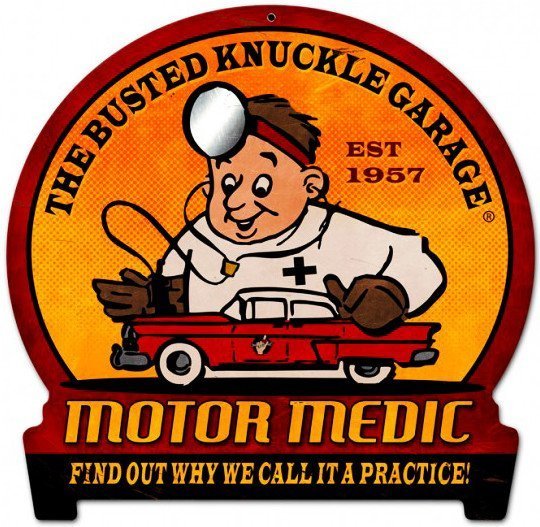 Motor Medic Round Banner Metal Sign measures 15 inches by 16 inches and weighs in at 2 lb(s). This Round Banner Metal Sign is hand made in the USA using heavy gauge American steel.