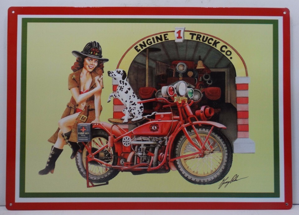 Pin Up Girl with Fire Department Motorcycle and Dalmatian Metal Sign