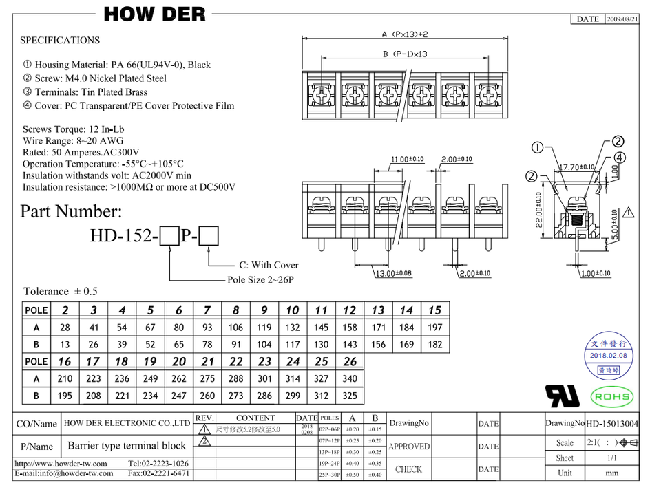 2PCS HD-152-4P Howder 13mm 4 Position Barrier Type Terminal Block 50A 300V