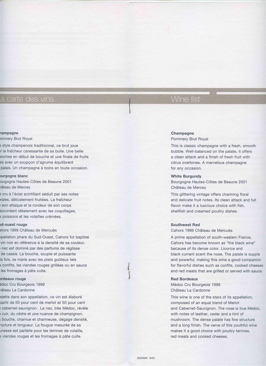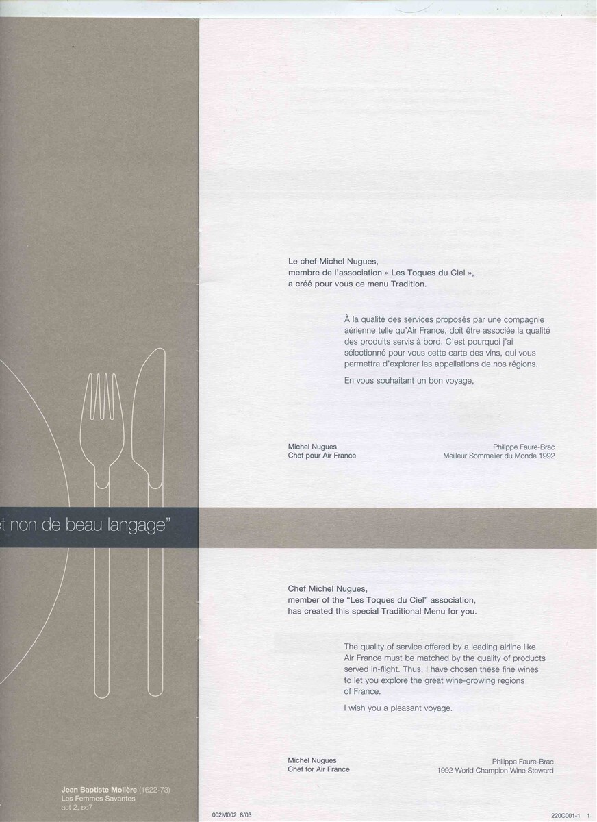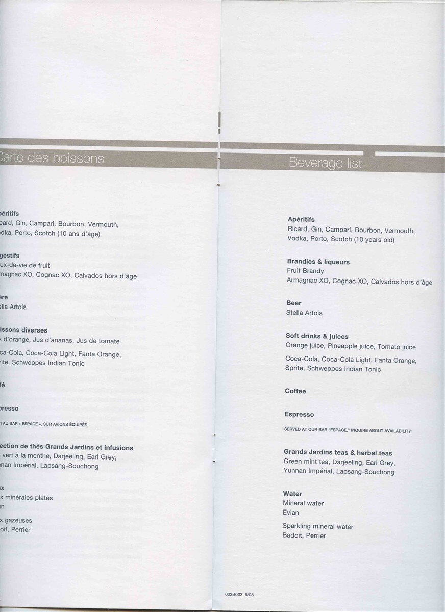 Air France L'espace Affaires Menu Meal Service and Beverages 2003 France - AME