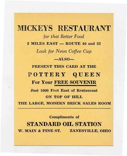 A single sided card, measures about 3" x 4" and has blank back. Advertising Mickey's Restaurant, a free souvenir at Pottery Queen, compliments od the Standard Oil Station on W Main Pine Street in Zanesville Ohio . Circa 1950's.