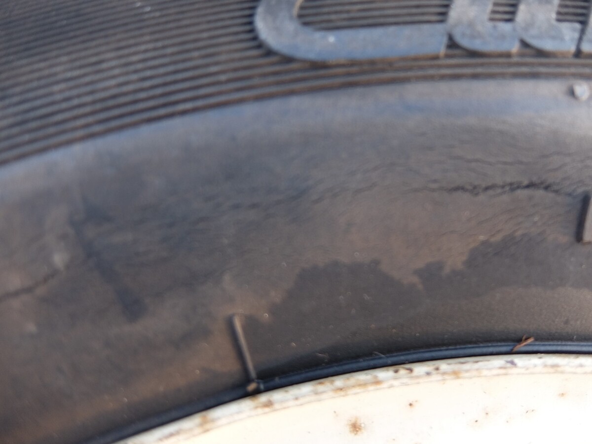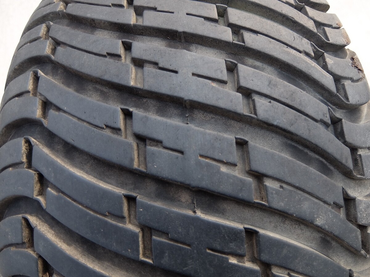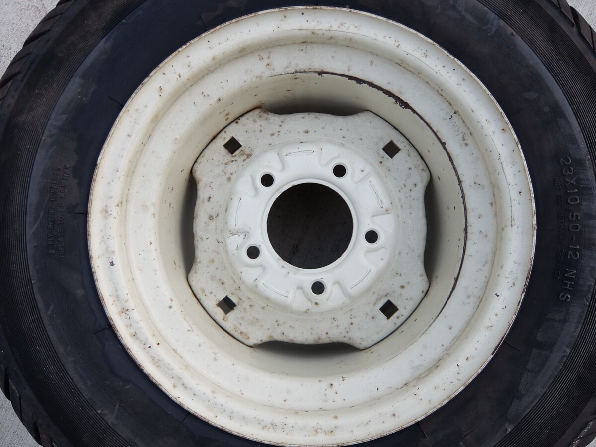 This is a used rear wheel and tire assembly that was removed from the tractor below. The tire is Cub Cadet brand and is 23x10.50-12. It has about 90% tread. Note that the wheel shows some sprinkled light rust spots on the backside of the wheel. The tire shows some very light cracking as shown. The tire is tubeless but seems to hold air fine. We think it makes a good spare tire or an option if someone wants to restore a mower with original Cub tires.