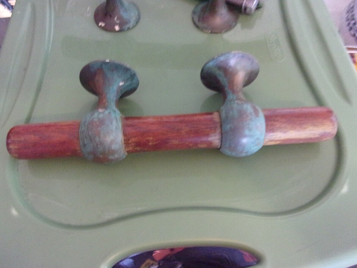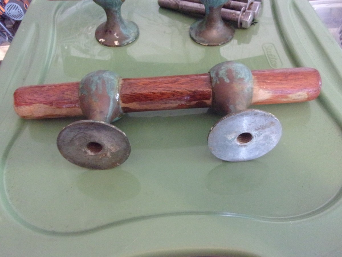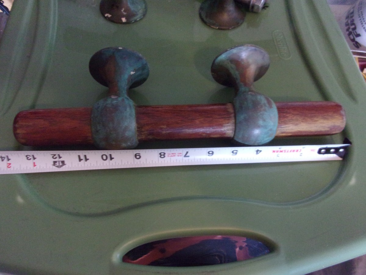 the teak measures 13-1/2" long and 1-3/8" diameter. The two bronze pieces measure 4-1/4" high, 2-3/4" diameter at base