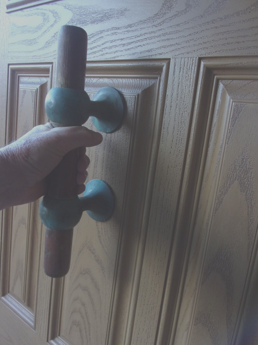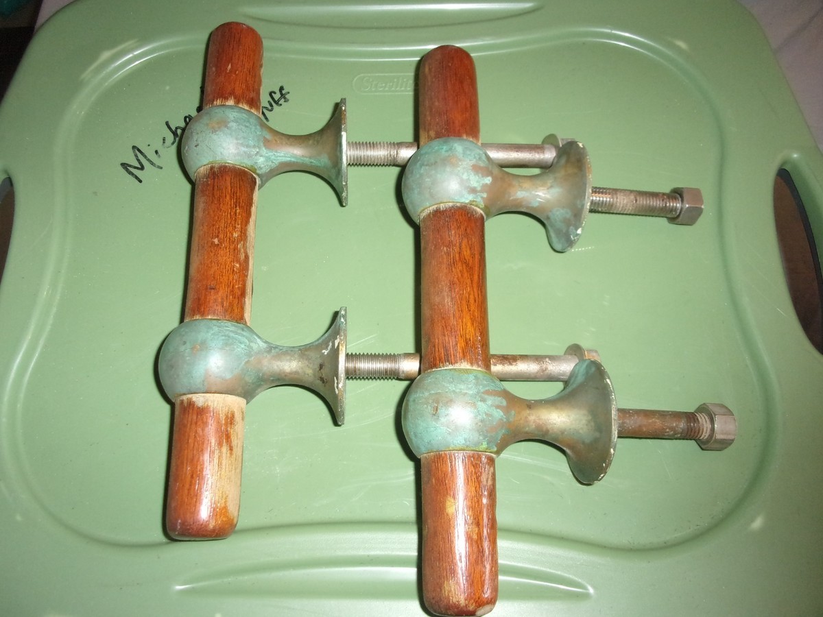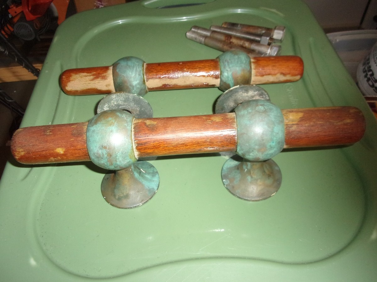the teak measures 13-1/2" long and 1-3/8" diameter. The two bronze pieces measure 4-1/4" high, 2-3/4" diameter at base