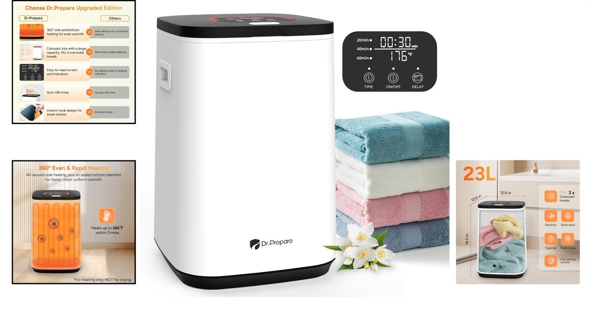 Luxurious design accommodates up to 3 oversized bath towels and can also warm bathrobes, blankets, pajamas, hair drying towels, and plush robes.