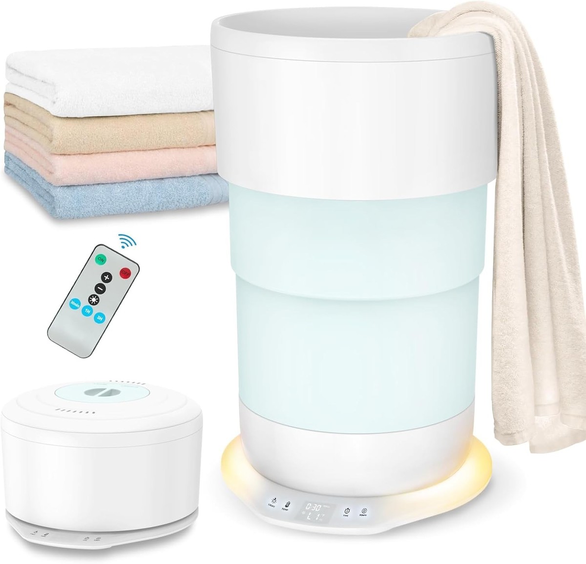 Features: Adjustable Temperature,Timer Function,Ambient Lighting,Auto Shut Off,Foldable Design,Hooks for Hanging,Portable,Space-saving,Adjustable heating times,3 level temperature settings,No high-pitched noise during operation,Infuse aromatherapy fragrant towels,Auto shut-off after 4 hours,Hanging hooks for additional items