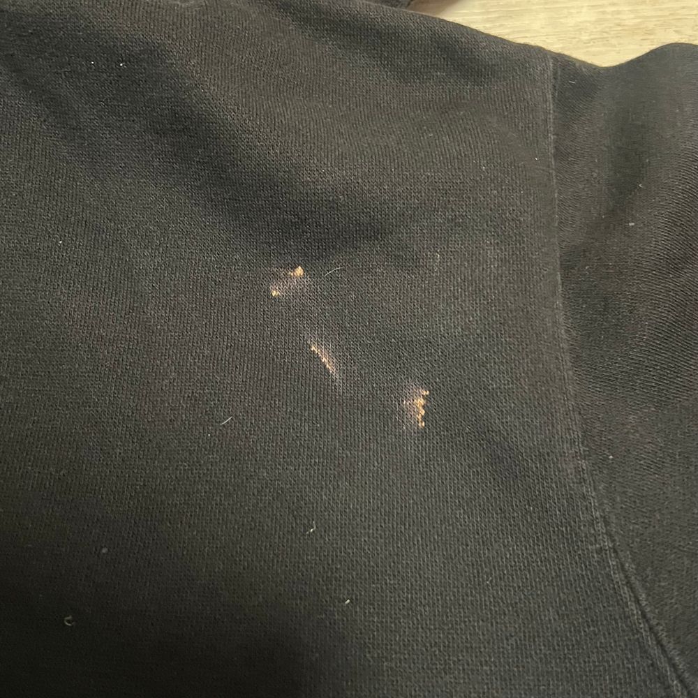 See all photos. A bit faded but nothing bad. Bleach stain on the back right shoulder