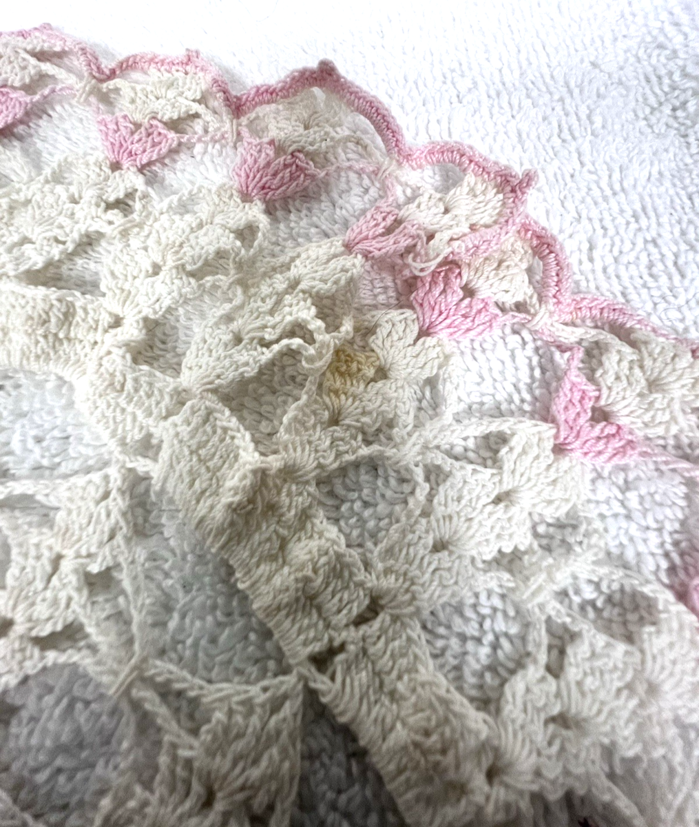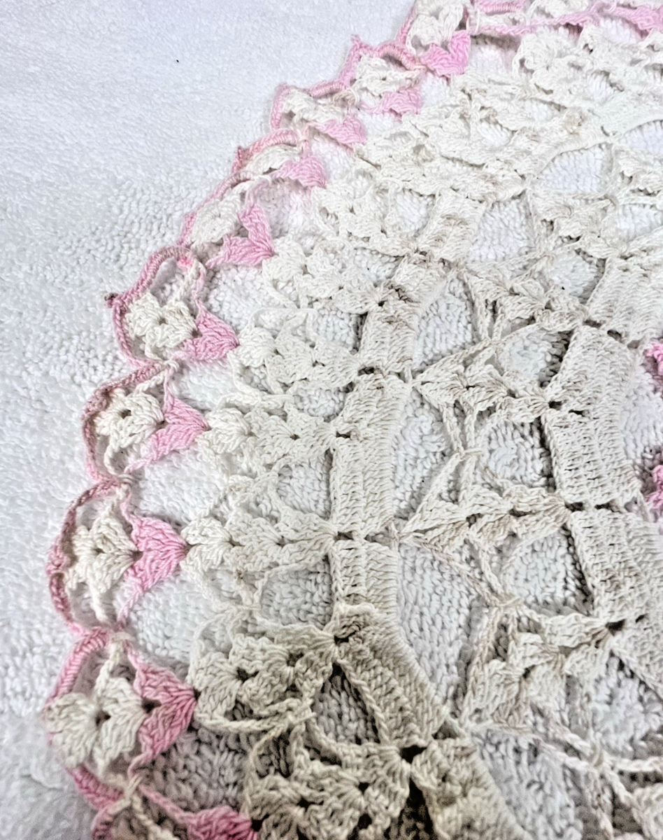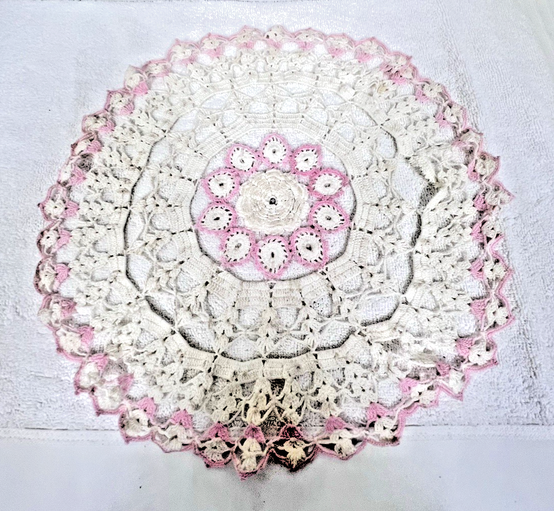 Handmade Grandma Core Crochet Pink Floral Doily 14" Need Cleaning