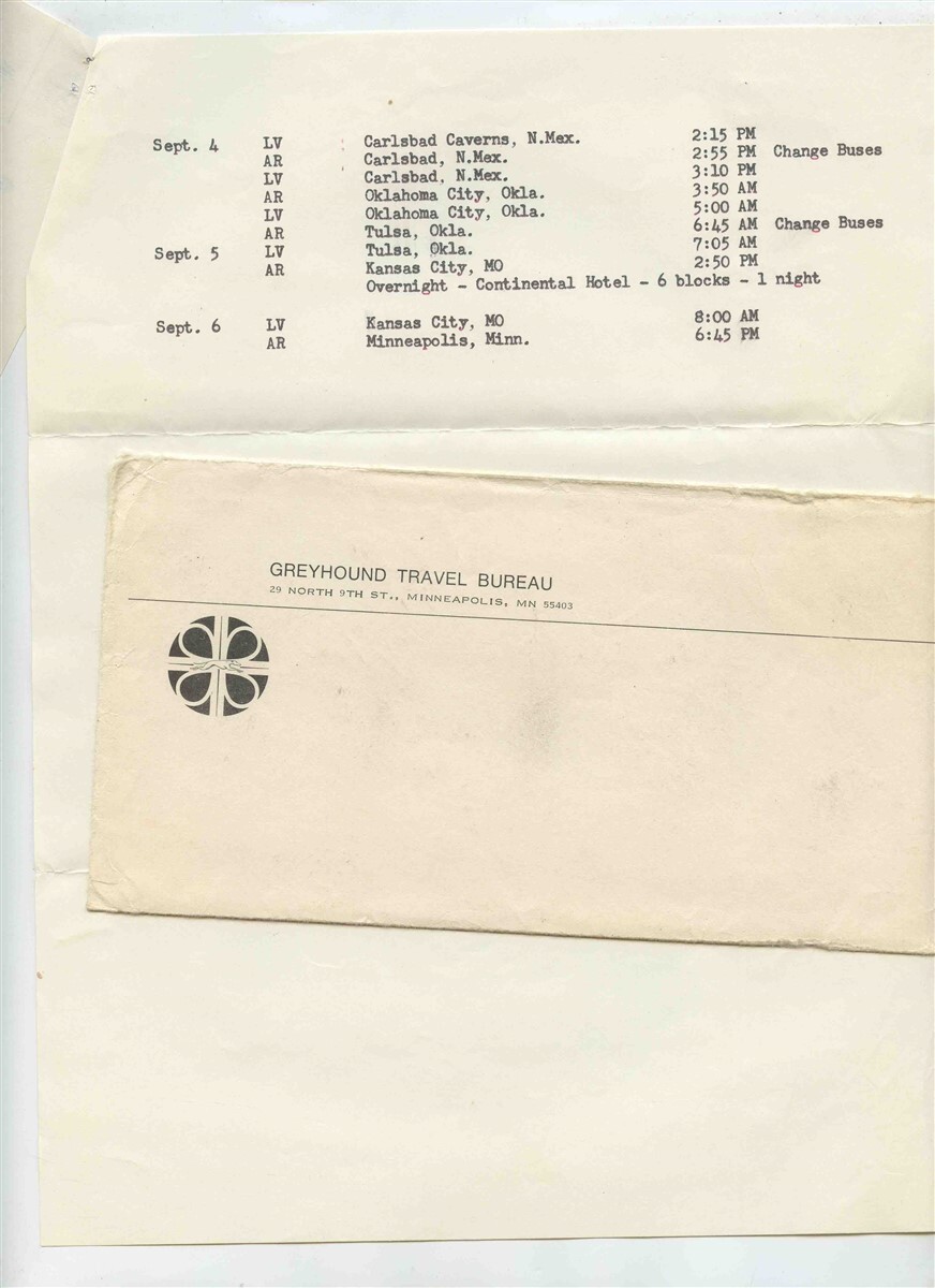 1950's Northland Greyhound Bus Lines Travel Bureau Tour Documents for a trip from Minneapolis, Minnesota to Salt Lake City, to Flagstaff Arizona, Phoenix, El Paso Texas, and back to Minneapolis. Lots of stops along the way. There are 2 pages of travel information and detailed itinerary stapled and a Greyhound Travel Bureau Envelope. With a Greyhound Route Map on the back of the first page. . In fine condition . , Circa 1950's. Due to the size limitations of my scanner, the entire item may not show in some of the scans. Has hand notations on the margins.