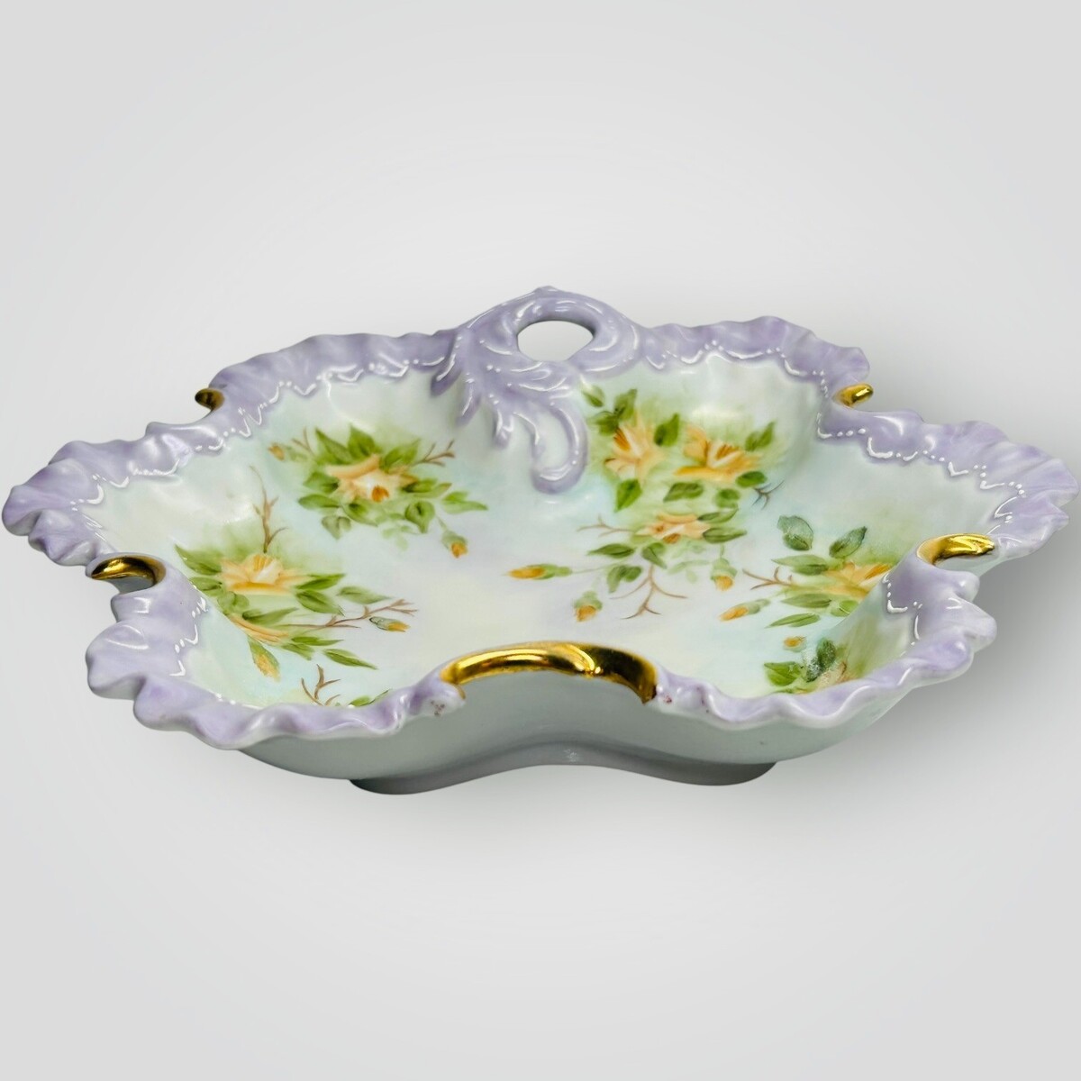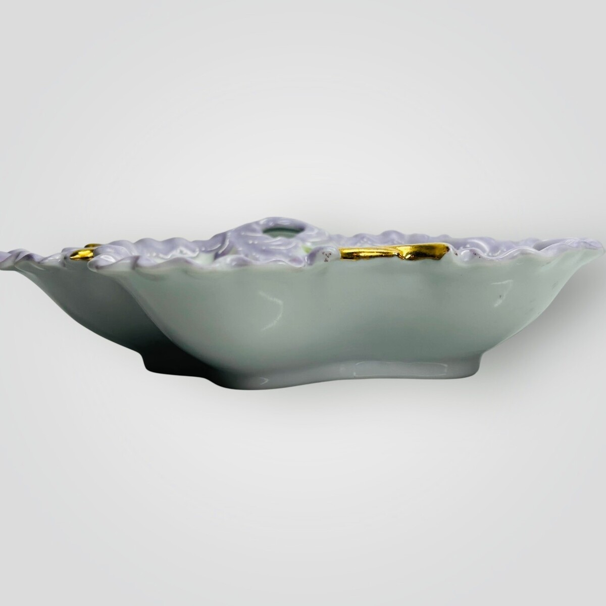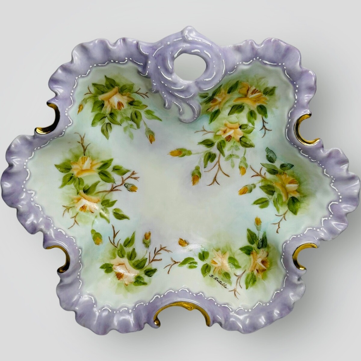 Hand Painted Porcelain Scalloped Bowl - Purple Floral Gold Gilt - J. Rotello VTG