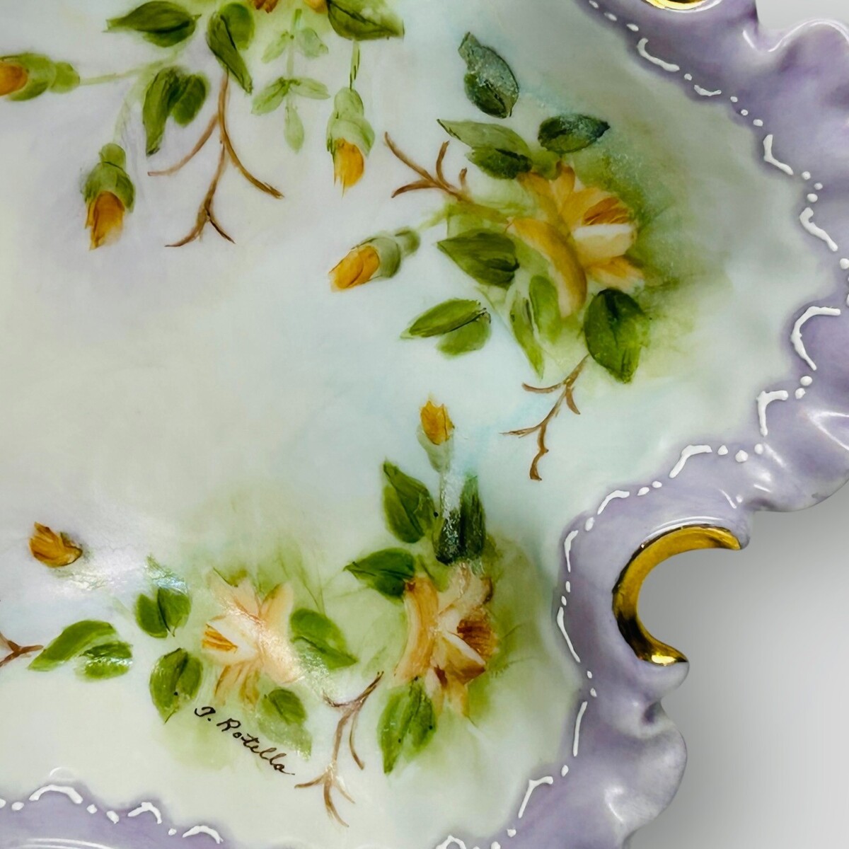 ? Border: Deep lavender/purple scalloped edges with raised white "beaded" enamel detailing.