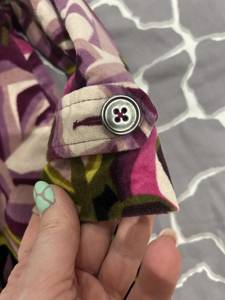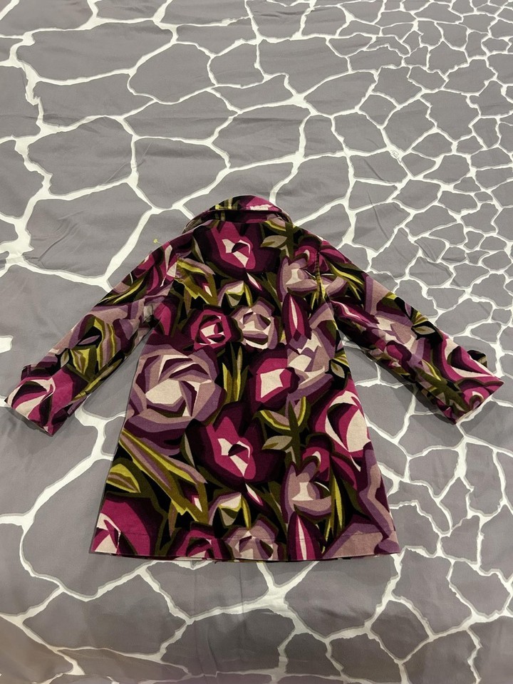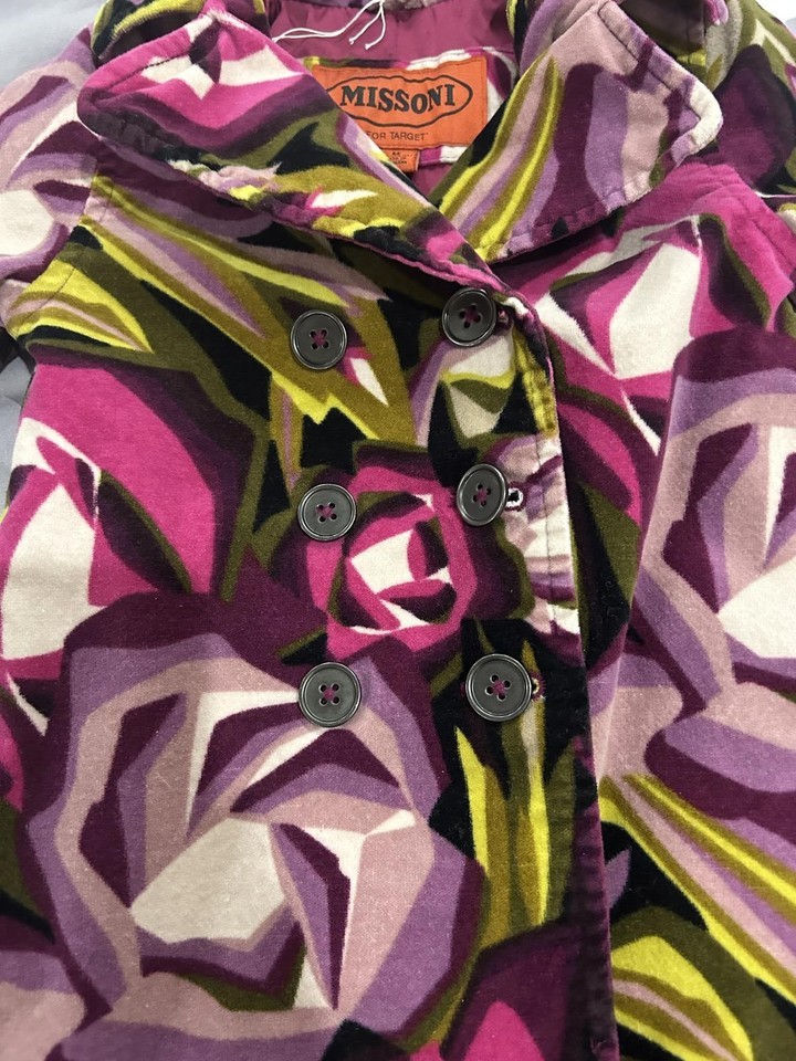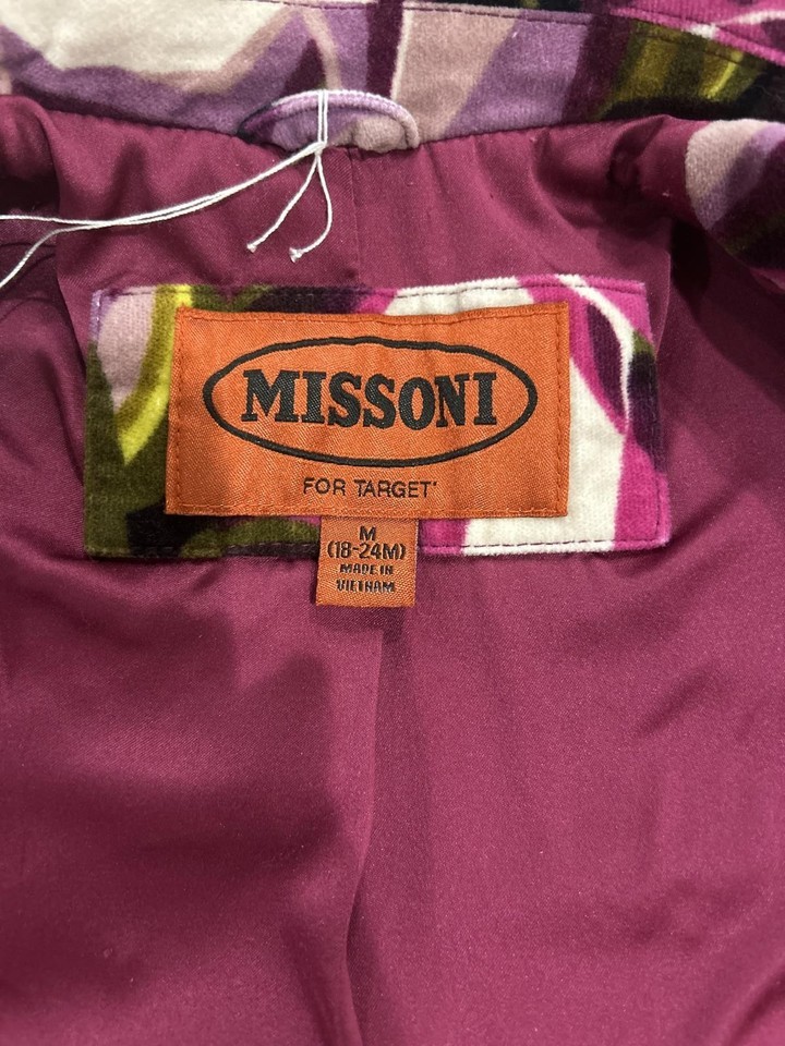 Adorable baby girl coat by Missoni for Target, size 18-24 months. Features a vibrant floral pattern in shades of purple, pink, and green. Made with a shell of 97% cotton and 3% spandex for comfort and flexibility. Fully lined with 100% polyester. Perfect for cooler weather to keep your little one stylish and warm.