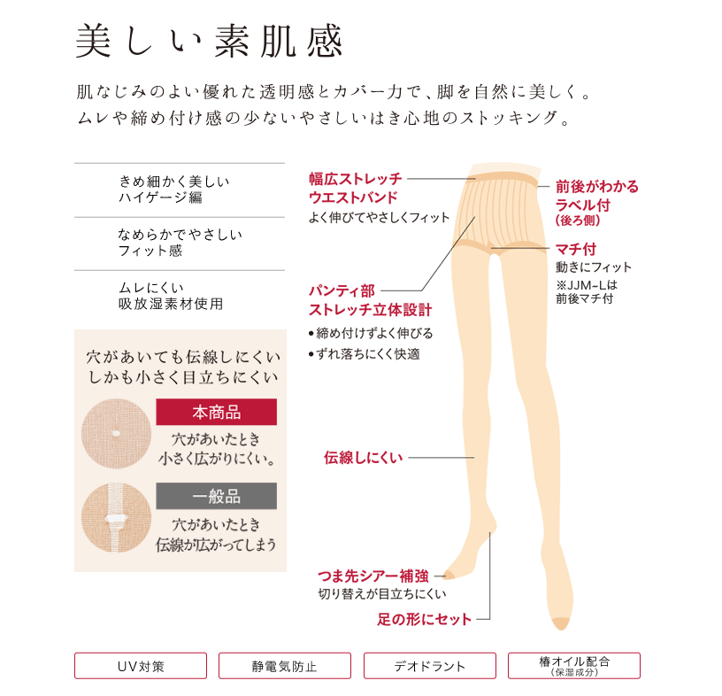 The beautiful, finely detailed high-gauge knit makes your legs look naturally beautiful just by wearing them. The sheer reinforcement makes the seams less noticeable so that your toes look beautiful even when you take your shoes off, making them durable and beautiful all the way to the toes.