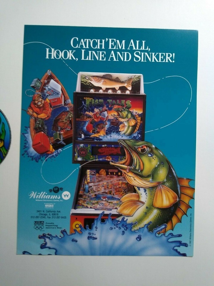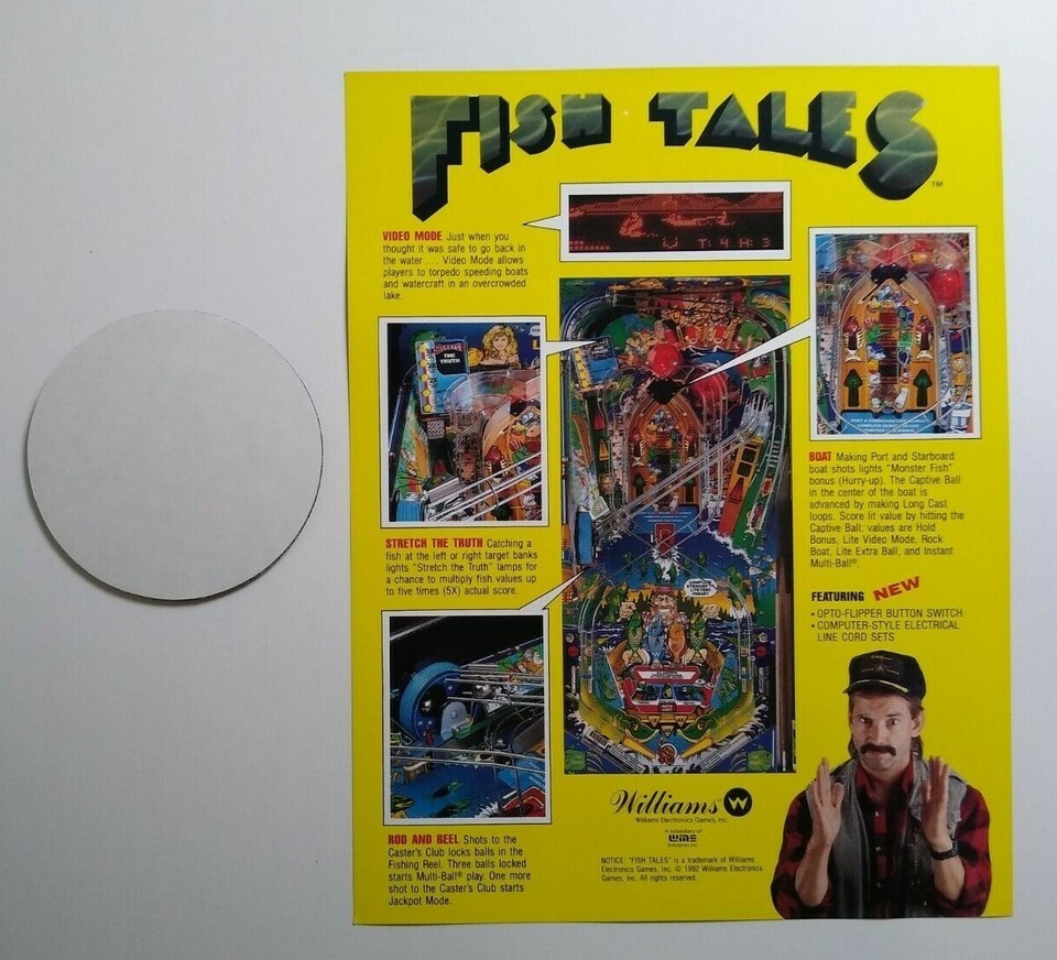 New old stock promo sales flyer and plastic coaster for the Williams Fish Tales game. Flyer is 8.5" x 11" size. Coaster is 3.5" size.