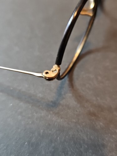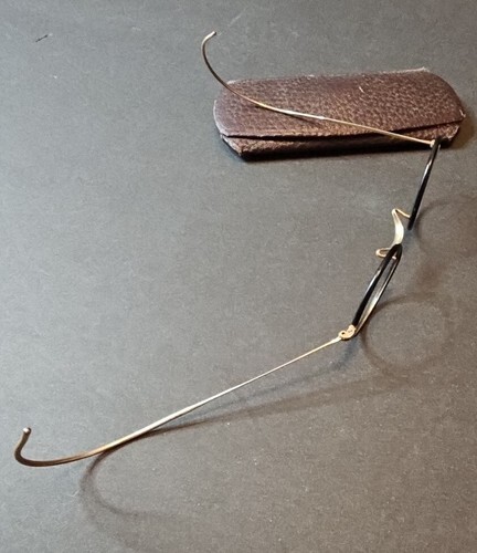 Condition: One lens is missing. The left hinge needs adjustment or a replacement screw. Frames show age-appropriate wear and patina.