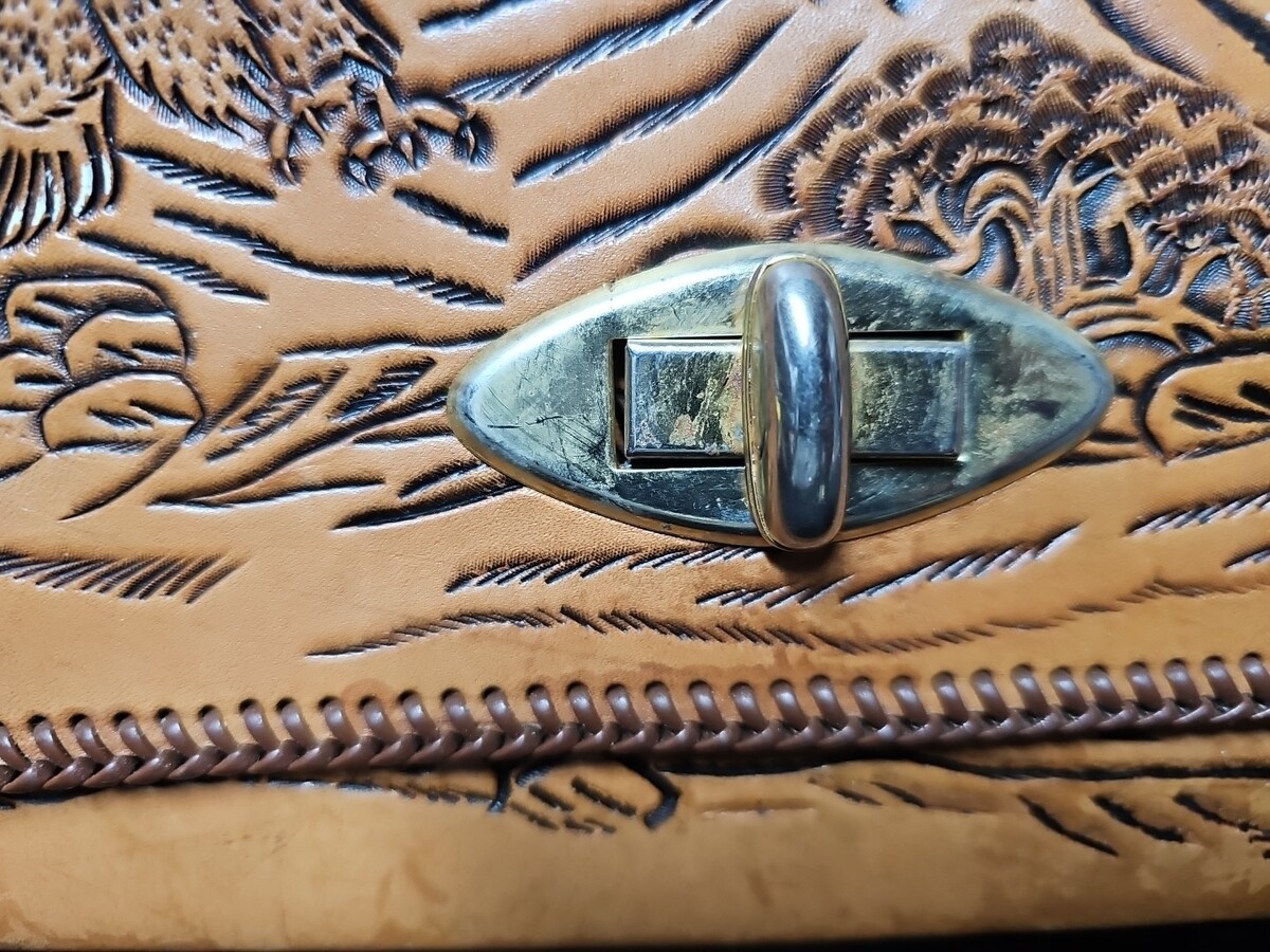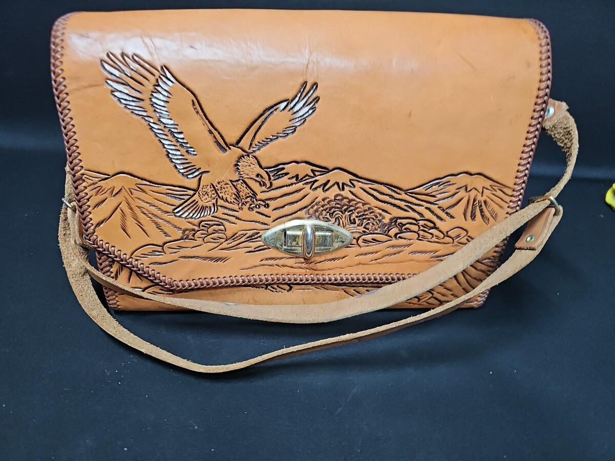 UP FOR SALE: Vintage Tooled Leather Crossbody Bag Boho Eagle Festival Purse Western Handmade. This is an amazing vintage find. I needs to have some leather conditioner. It is really in good condition--a few marks on the handle that leather cleaner will fix right up. The handle can be lengthened or shortened