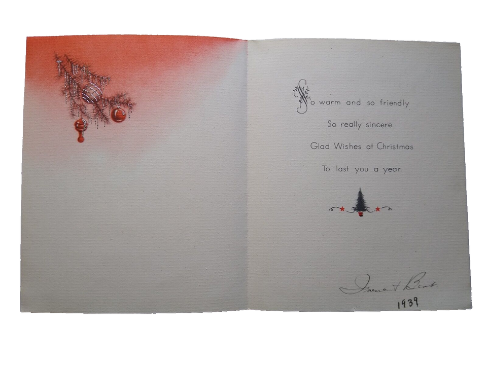 Circa 1939 vintage original greeting card. Has glitter accents. Has wrinkles and age wear. Size is 5.5" x 4.5." opens larger. Back side is damaged due to album removal. Stock#gc136.