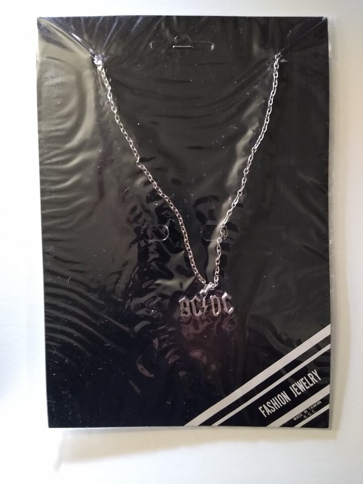 This listing includes the AC/DC logo necklace as pictured, sealed in its original carded blister packaging. The packaging identifies the item as "FASHION JEWELRY" and states its origin as "MADE IN TAIWAN R.O.C."